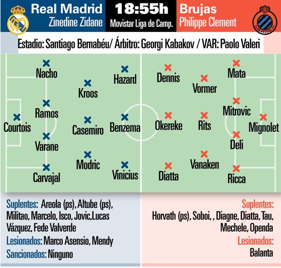 Sobre el papel, el Madrid es favorito ante el Brujas que, sin embargo, llega al Bernabéu sin ningún miedo. El equipo belga está imbatido en los cinco últimos encuentros y es líder del campeonato nacional. El Brujas despliega un juego ágil y ofensivo y quiere dar la sorpresa y enseñar los colmillos en el Santiago Bernabéu. El regreso al once de Federico Ricca, con pasado en España tras jugar en el Málaga, se presenta como una de las posibles novedades del once. No juega desde la primera jornada por un golpe y ya el sábado estuvo en el banquillo. Una lesión en el bíceps femoral provoca la única baja por lesión de Éder Balanta.