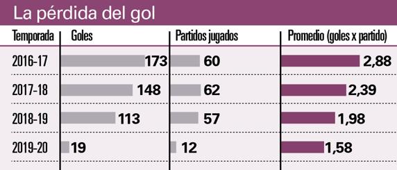 El Real Madrid parece haber perdido la gracia del gol. Y no es sólo, aunque también sin duda, por la marcha de Cristiano Ronaldo. Desde la temporada 2016-17 su media de goles por partido está cayendo de manera alarmante y progresiva hasta alcanzar, en lo que llevamos del presente curso, una media de 1,58 tantos por encuentro. Casi la mitad que la firmada hace apenas tres temporadas.