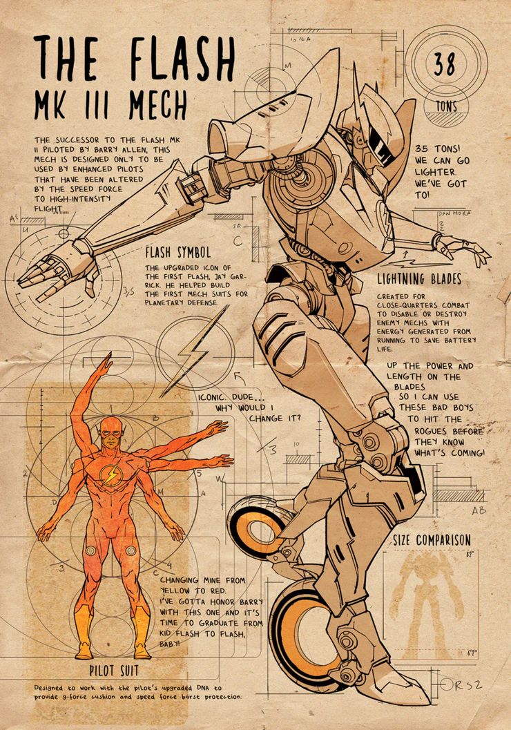 En DC: Mecánico por DC Comics, los héroes y villanos más grandes y la Tierra operan en robots de tamaño gigante, ya que la era anterior de los héroes los llevó a adoptar los trajes blindados de forma permanente. En la serie, la Sociedad de la Justicia de América, incluido Doctor Fate, fue asesinado cuando Darkseid desató un solo Parademon del tamaño de un kaiju en el planeta, mostrando que el mundo necesitaba una nueva forma de lidiar con los ataques alienígenas. Conduciría a un mundo de mechs, donde incluso The Flash se ha equipado con una armadura rediseñada que hace que su velocidad sea un nuevo tipo de arma.