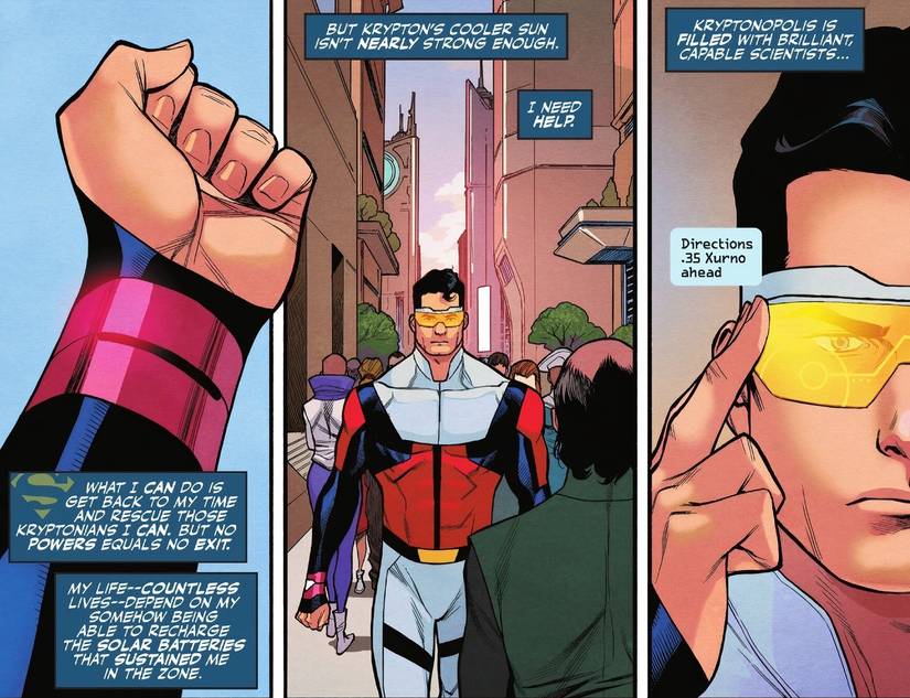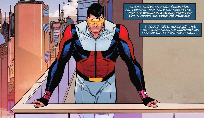 Superman ha cambiado oficialmente su equipo de superhéroe por algo que se adapta mejor a Krypton. Este nuevo rediseño tiene un ambiente minimalista y futurista que vincula visiblemente al Hombre de Acero con su herencia alienígena. En lugar de su combinación de colores rojo y azul, luce rojo y negro sobre un blanco prístino. Además, el traje carece de la capa de Superman, lo que refleja cómo ya no puede actuar como Superman debido a su impotencia en Krypton. Cuando Clark Kent no está disfrazado, generalmente se apega a los relajados cuadros de un granjero, por lo que este atuendo refinado es un cambio audaz.