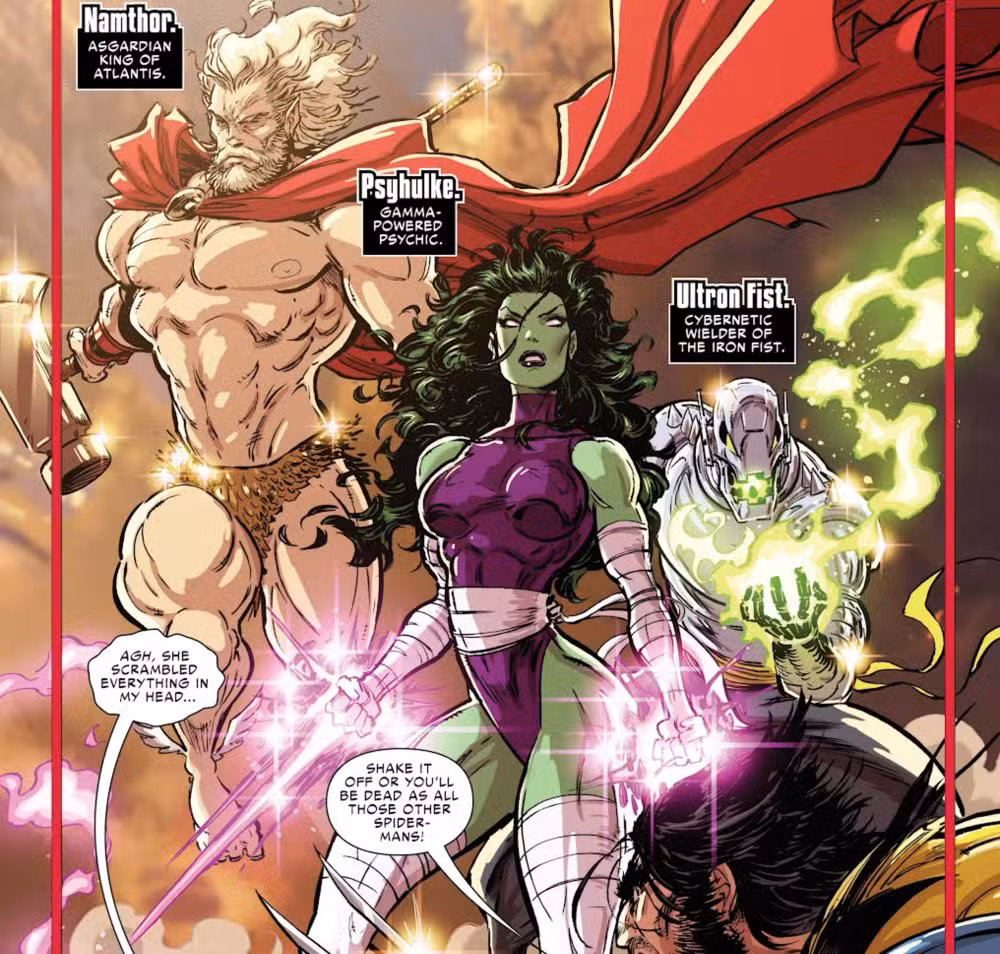 en esta semana Spider-Man y Lobezno #8 – de Marc Guggenheim, Kaare Andrews, Brian Reber y Travis Lanham – Wolverine y Spider-Man se encuentran en la realidad natal de Arachnix, la Tierra-4587. Allí, conocen a ‘Los Vengadores’: Namthor (Namor/Thor), Psyhulke (Psylocke/She-Hulk), Ultron Fist (Ultron/Iron Fist) y Hulk Panther (Hulk/Black Panther).