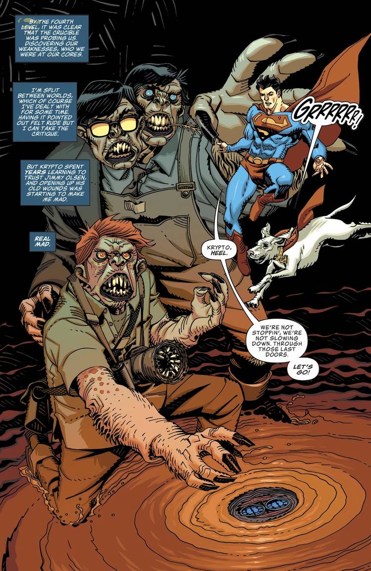 En la historia “El crisol” de Collin Kelly, Jackson Lanzing, Cully Hamner, Dave McCaig y AndWorld Design de Días caninos del verano #1, Superman lleva a Krypto con él mientras se infiltra en una misteriosa nave alienígena que llega a la Tierra. En el interior, cada nivel de la nave presenta una prueba destinada a jugar con la cabeza de Superman y descomponerlo psicológicamente. A medida que la nave descubre su debilidad, Los demonios internos de Superman toman forma física – y es un espectáculo horrible de contemplar.