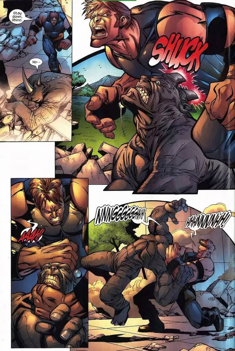 Durante su pelea en X-Men asombrosos #435, Rhino demuestra que sus cuernos pueden perforar la piel de Juggernaut. Es el único ataque que Rhino ha demostrado que parece capaz de dañar a Juggernaut. Si bien Juggernaut pudo sacar los cuernos y finalmente dominar a Rhino, esto muestra que Rhino realmente podría lastimar a Juggernaut si tuviera la fuerza para igualarlo. Este enfrentamiento no es tan unilateral como los fanáticos podrían pensar. Lo único que frena a Rhino es su fuerza inferior, pero la ha aumentado en el pasado con su tratamiento de radiación gamma.