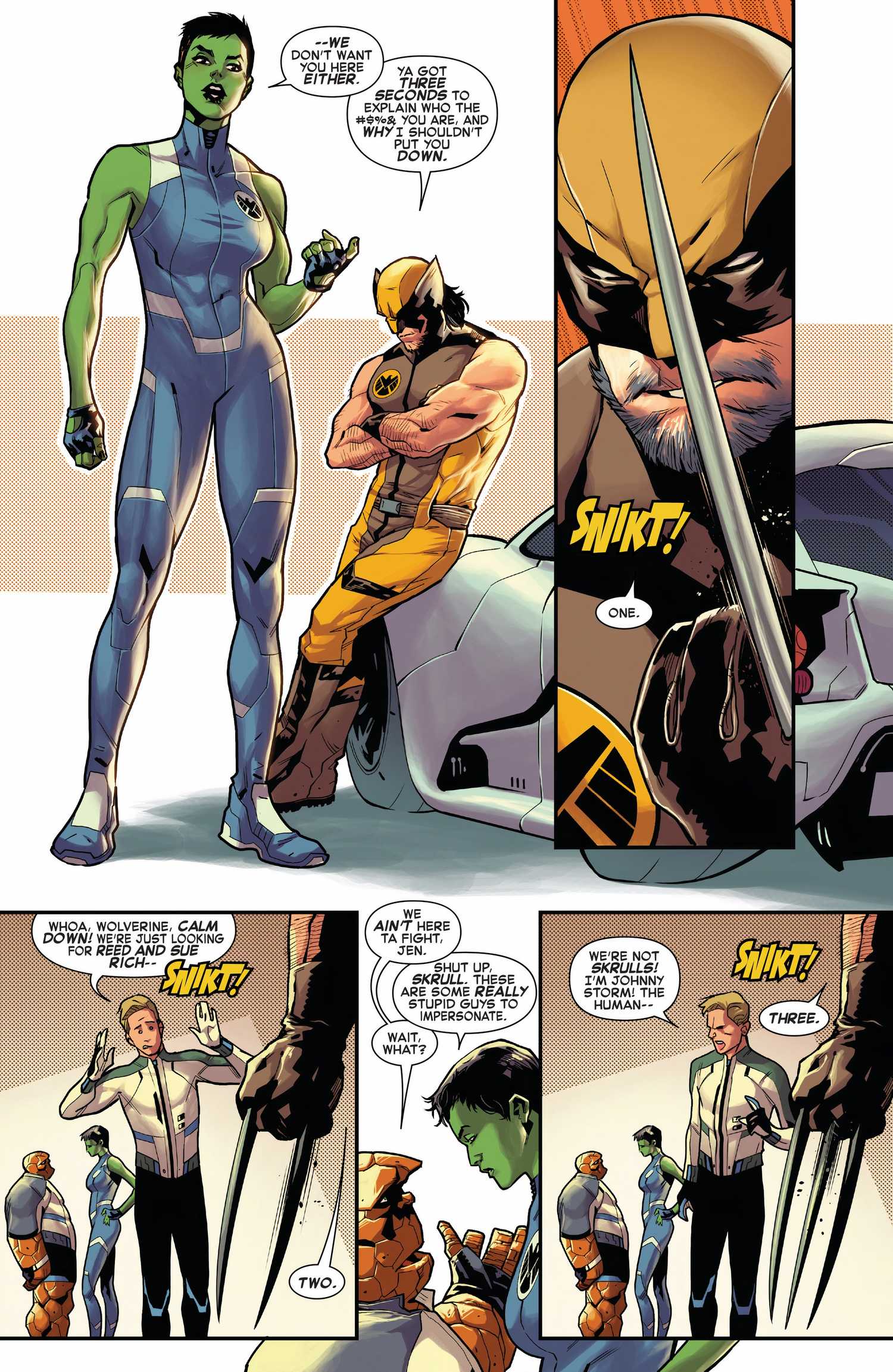 Utilizando una pieza de tecnología que Reed dejó llamada Multisecto para “explorar juntos las maravillas del Multiverso”, Johnny y Ben viajan a una nueva realidad donde se encuentran de inmediato con variantes de Wolverine y She-Hulk que visten trajes únicos pero familiares exclusivos de este universo alternativo. Blandiendo un logotipo de SHIELD en su pecho, Wolverine está vestido con un traje similar a su disfraz marrón y naranja favorito de los fanáticos. Visto más recientemente durante la Era Krakoan, con esta versión sin mangas del atuendo que le da a Logan un diseño más estilizado al tiempo que introduce suficientes elementos sutiles para hacer de este rediseño un éxito rotundo.