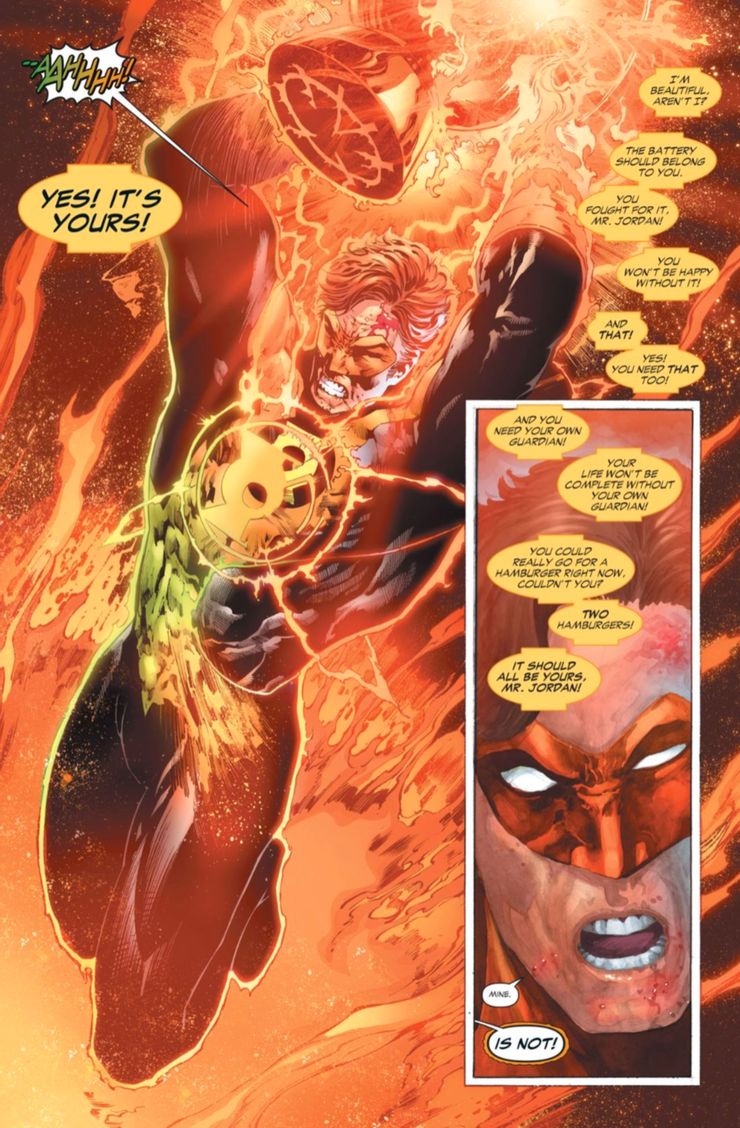 En Linterna Verde #42 por Geoff Johns, Philip Tan y Eddy Barrows, Jordan se enfrenta a Larfleeze, también conocido como el Agente Naranja, el único poseedor de la batería de energía Orange Lantern. De la misma manera que los Green Lanterns funcionan con voluntad, Larfleeze se alimenta de una codicia insaciable. Mientras los dos pelean entre sí, Jordan reconoce que la batería que Larfleeze se niega a soltar ayuda a mantener su anillo completamente cargado, lo que le permite bombear cientos de construcciones. Aprovechando una breve distracción causada por los Guardianes del Universo, Hal se aferra a la batería y se la quita de las manos a Larfleeze. Green Lantern se siente abrumado por los pensamientos de una voz misteriosa, que lo insta a satisfacer sus deseos que incluyen, curiosamente, un par de hamburguesas.