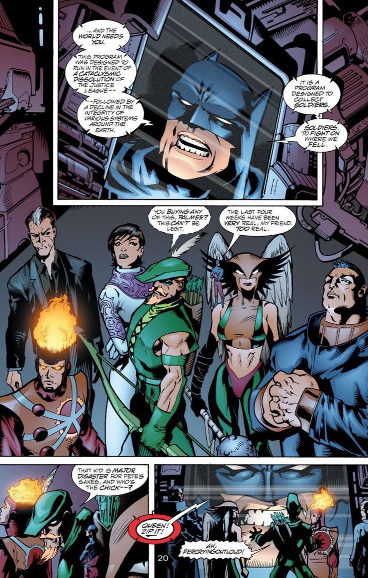Si no fuera por la activación del plan de contingencia de Batman, el mundo moderno no habría tenido una Liga de la Justicia. Afortunadamente, tenía un plan de este tipo que entra en vigor un mes después de la desaparición del equipo original. En su plan, se enviaron drones por todo el mundo para elegir a los héroes ideales dignos de unirse para formar una Liga de la Justicia completamente nueva. Incluidos en esta alineación estaban Nightwing, Faith, Green Arrow, Hawkgirl, Jason Blood y Major Disaster.