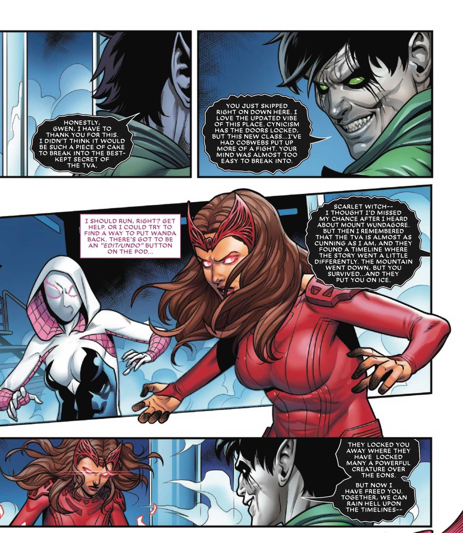 Sin embargo, Scarlet Witch no está agradecida con Nightmare por liberarla. En cambio, explota la pesadilla con magia antes de dirigir su atención a Gwen. Pero Nightmare se defiende, enojado por la falta de apreciación de Scarlet Witch por su nueva libertad. Los dos comienzan a pelear mientras Ghost-Spider alerta al TVA, cuya base lentamente se vuelve cada vez más inestable durante la pelea de Wanda y Nightmare. Todo lo que la bruja escarlata quiere es irse, pero la TVA ni la pesadilla la dejará irse sola. La batalla se enfurece hasta que Wanda y Nightmare se separan, dando al TVA la oportunidad de actuar.