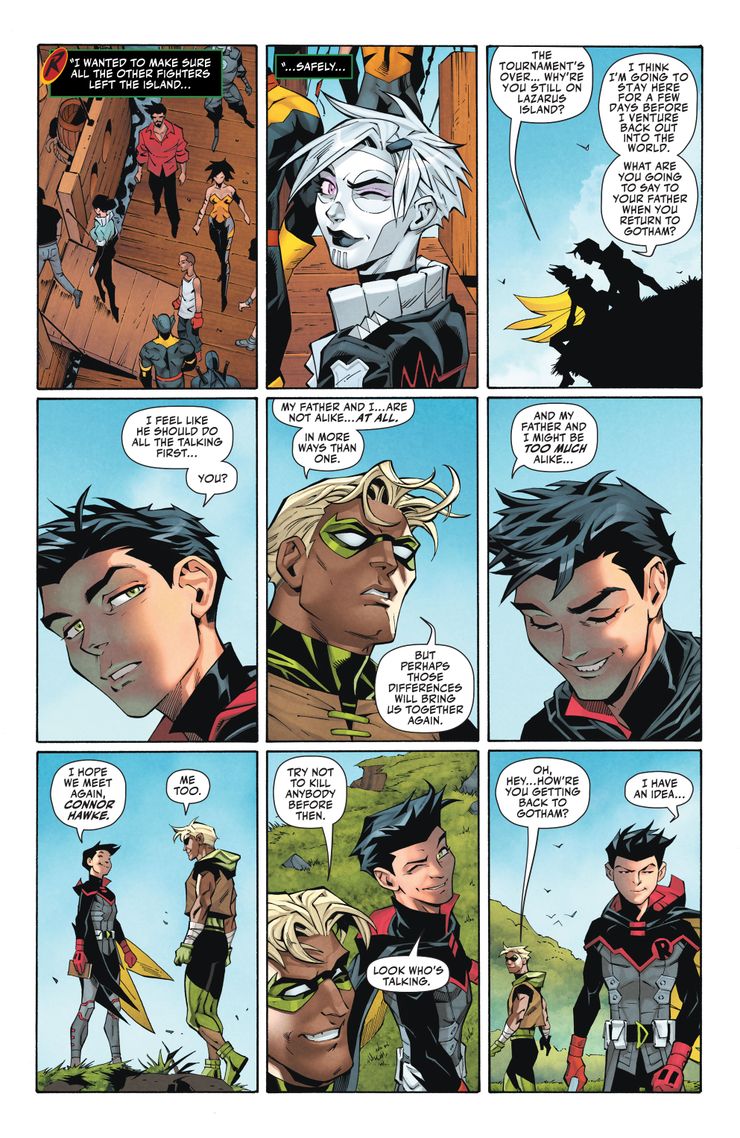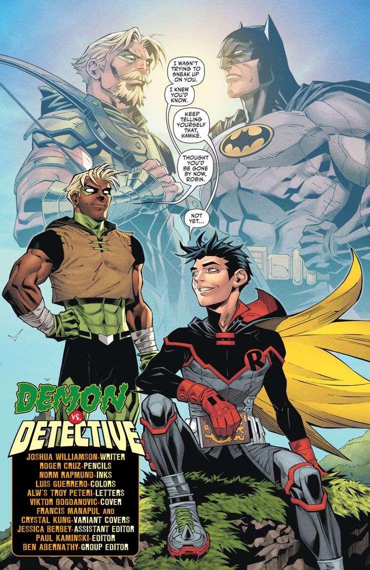 Ahora, Petirrojo #12 de Joshua Williamson y Roger Cruz ve a Damian decidiendo regresar a su hogar en Gotham City. Sin embargo, cuando Connor Hawke le pregunta a Robin qué planea decirle a su padre cuando llegue a casa, Damian responde que cree que Batman debería hablar más si los dos esperan arreglar las cosas. Si bien Damian probablemente tenga razón acerca de que Batman tiene un papel más importante detrás de por qué el Dynamic Duo se separó, indica que una reunión no ocurrirá solo porque Damian regrese a casa. Batman en realidad está fuera de Ciudad Gótica cuando llega Damian, lo que retrasa su inevitable confrontación.
