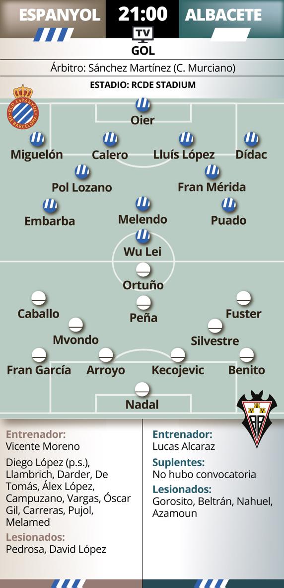 Ante el Albacete, Moreno tiene dos bajas notables (Pedrosa y David López), aunque cuenta con un bloque potentísimo y con jugadores de primer nivel como Raúl de Tomás o Marc Roca. El canterano, al igual que Cabrera, se ha recuperado a tiempo para este estreno liguero, aunque lo más probable es que parta como suplente. El entrenador perico priorizará aquellos futbolistas que han acumulado más minutos en pretemporada y que llegan a este encuentro con mejor rodaje, por lo que todo indica que Lluís López y Fernando Calero serán los centrales titulares y Pol Lozano y Fran Mérida, la pareja del centro del campo.