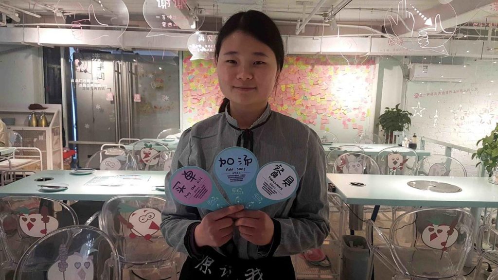 CHINA – Con mirada de concentración y una sonrisa tímida en el rostro, Cao Xueting distribuye a los comensales entre las mesas del restaurante donde trabaja. Lo hace en silencio, de forma tranquila pero resuelta, y cuando éstos le preguntan por el menú, rápidamente dirige sus ojos hacia unas tarjetas de colores.