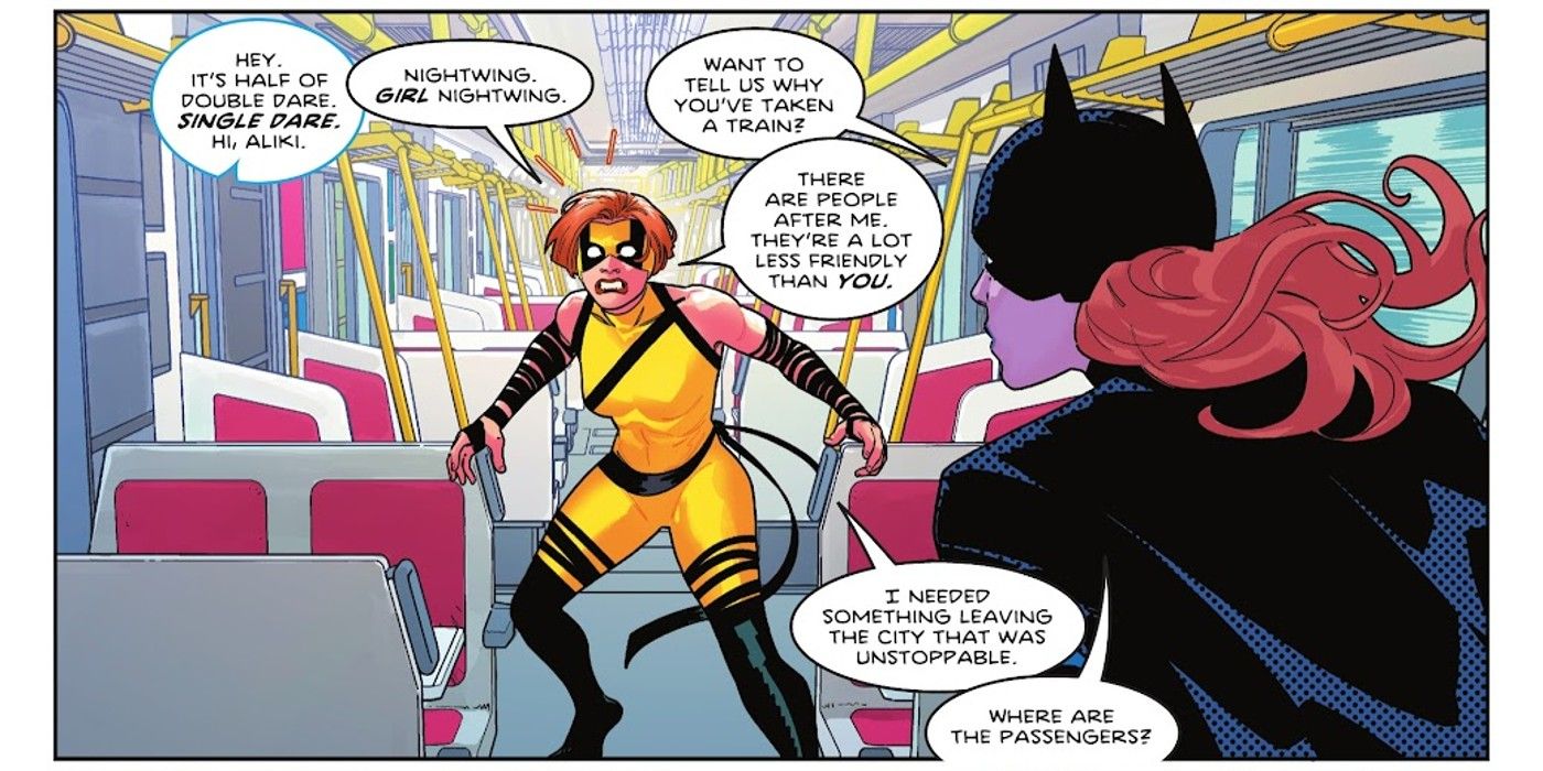 Ese punto de vista se vuelve aún más evidente en Ala noche #105 de Tom Taylor, Bruno Redondo, Adriano Lucas y Wes Abbott. En un tema que se ve enteramente desde el punto de vista de Nightwing, una llamada telefónica del alcalde de Blüdhaven y la media hermana de Dick, Melinda, pone a Nightwing y Batgirl a la caza de un arma biológica robada. Poco después de esa llamada, Dick y Barbara se visten y la poderosa pareja residente de DC busca a sus principales sospechosos: los gemelos Double Dare. Al investigar un comportamiento inusual que parece fuera de lugar incluso para los criminales profesionales, Nightwing y Batgirl rastrean a uno de los gemelos hasta el Tren M. Allí, encuentran a Aliki, sorprendida al encontrar a Nightwing y Batgirl tras su rastro. Excepto que ella no se refiere a ellos como Nightwing y Batgirl. Para Aliki, y probablemente para el resto de los ciudadanos de Blüdhaven, si no para el Universo DC en su conjunto, los dos son Nightwing y “Chica ala nocturna.“