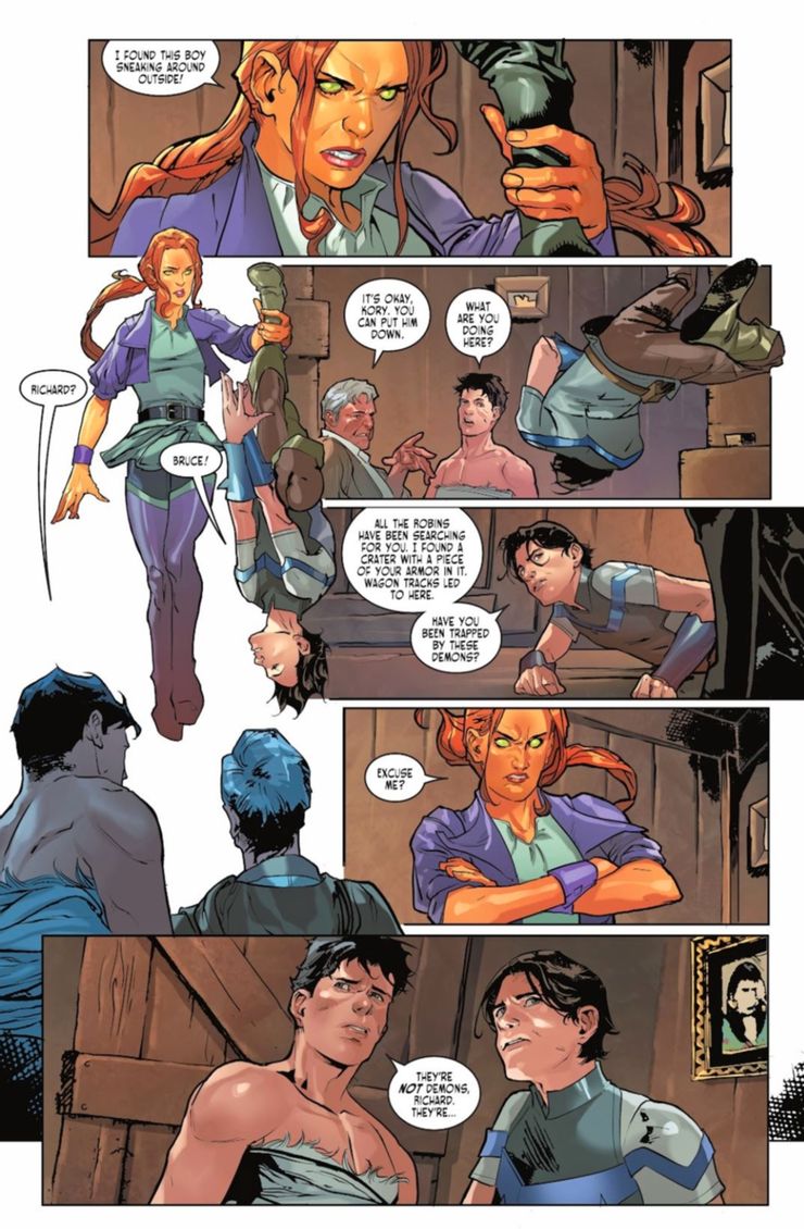 Aunque Nightwing y Starfire no han tenido una relación romántica en años en Prime Earth, la pareja tiene la oportunidad de comenzar de nuevo. En Caballeros Oscuros de Acero #7 por Tom Taylor y Nathan Gooden, el Batman mitad kryptoniano tiene sus heridas provocadas por el envenenamiento con kryptonita atendida por una versión medieval de los Teen Titans. Aunque Dark Knight ha arrestado a usuarios de magia, el equipo opta por salvarle la vida. Después de que los guardianes de los Titanes, Jonathan y Martha Kent, le dan algunos consejos a Bruce, Starfire alerta a sus camaradas sobre un intruso. El intruso al que ha atrapado, y al que cuelga de la pierna, es Richard Grayson, uno de los escuderos Robin de Bruce. Jonathan le asegura a Kory que el joven no hace daño, aunque ofende brevemente a Starfire cuando se refiere a ella y a su equipo como “demonios”.