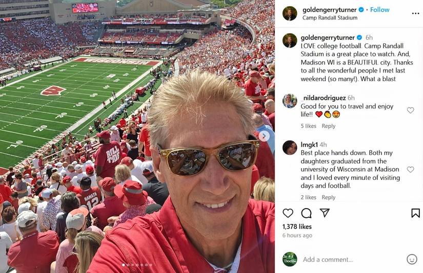 En este título de Instagram, Gerry también elogió el estadio Camp Randall, donde se llevó a cabo el juego, y el “hermoso” ciudad de Madison, Wisconsin. Calificó todo el evento como “explosión“asistir. Junto con la publicación se incluyeron varias fotos, la primera de las cuales mostraba a Gerry tomándose una selfie.con el campo de fútbol detrás de él. También posó con una estatua de la mascota del equipo de fútbol, ​​el tejón. Gerry luego incluyó fotos del Capitolio del estado de Wisconsin y la costa.