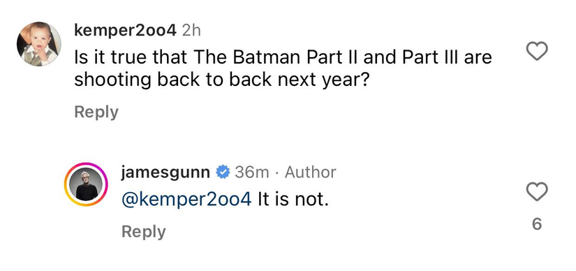 • James Gunn negó el rumor de que The Batman – Part II y The Batman 3 se filmarán consecutivamente en 2025.