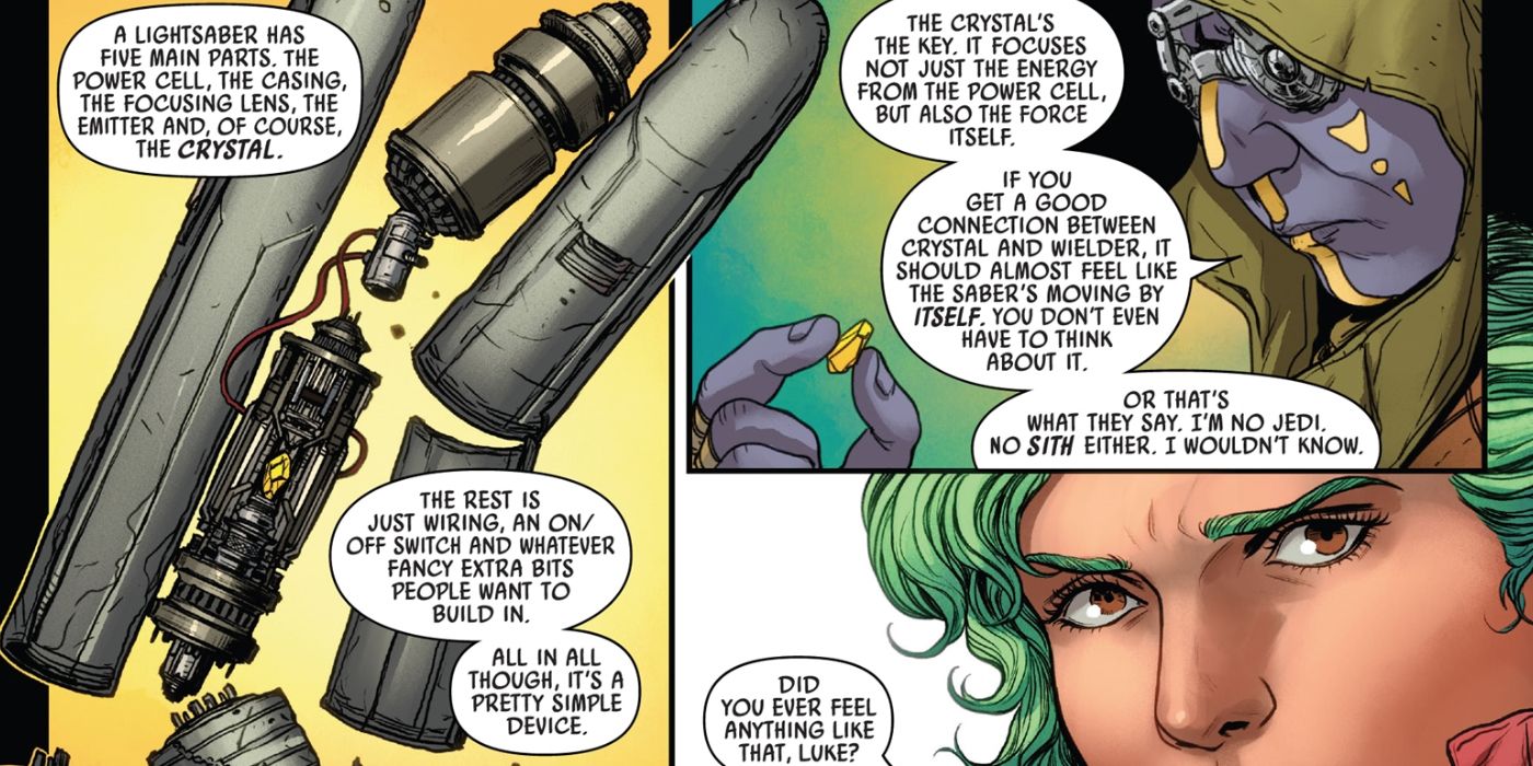 Advertencia: Spoilers de Star Wars #35Lucas Skywalker ha aprendido información crítica sobre sables de luz que implica que perdió contra Darth Vader en Cloud City debido a su sable de luz azul. Un experto en cristales kyber llamado Dr. Cuata le informa a Luke sobre cómo debería sentirse una verdadera conexión con un sable de luz, que se basa en parte en cómo el portador obtiene su arma. Desafortunadamente, los dos sables de luz de Luke, incluido el de su padre y el amarillo que encontró en un puesto avanzado Jedi, no cumplen con estos requisitos.