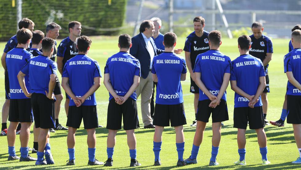 Hubo discurso del presidente a la plantilla en el centro del campo tras saludar uno por uno a todos los componentes del equipo, pero ni Aperribay ni Xabi