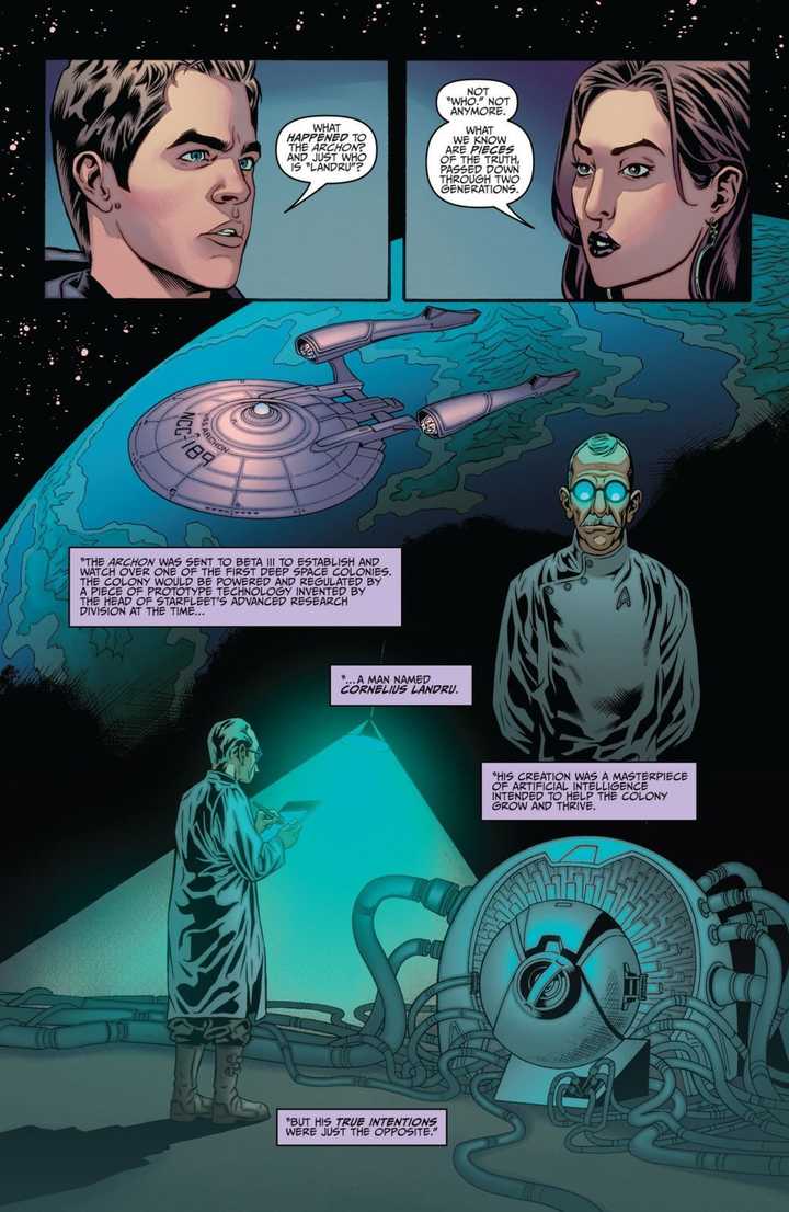 Trek #10 fue escrito por Mike Johnson y dibujado por Stephen Molnar. El problema revela que Landru, la supercomputadora que esclavizó a los sobrevivientes del Arcontefue el producto de un “científico loco” del siglo 22 que trabajaba para la federación.