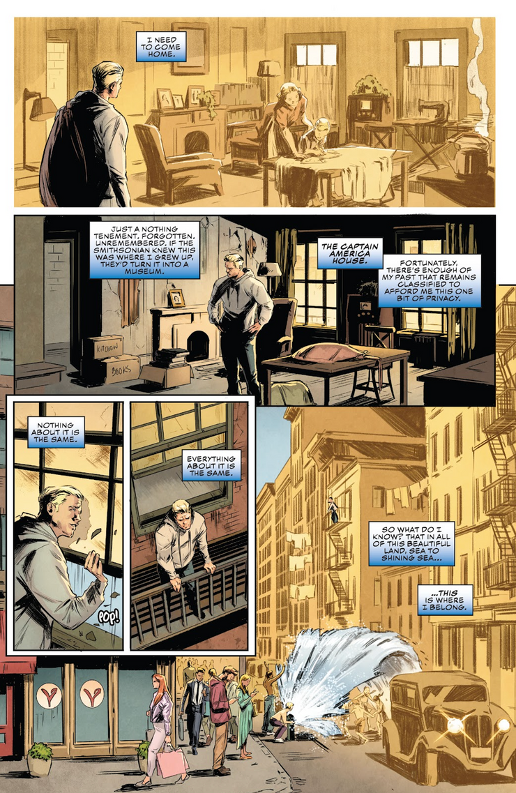 Así, en Capitán América: Centinela de la Libertad #1, escrito por Jackson Lanzing y Collin Kelly con arte de Carmen Carnero, Steve Rogers decide dejar el disfraz por un tiempo y regresar a sus raíces como un simple residente de Brooklyn en la ciudad de Nueva York. Alquila un apartamento viejo pero anodino en su antiguo vecindario, que, sin que todos lo sepan, es en realidad el hogar de su infancia. “Si el Smithsonian supiera que aquí fue donde crecí”, musas rogers “Lo convertirían en un museo. La Casa del Capitán América”. Afortunadamente para él, gran parte de su información personal sobre sus primeros años de vida fue (y sigue siendo) clasificada, lo que le permitió a Rogers buscar un mínimo de privacidad.