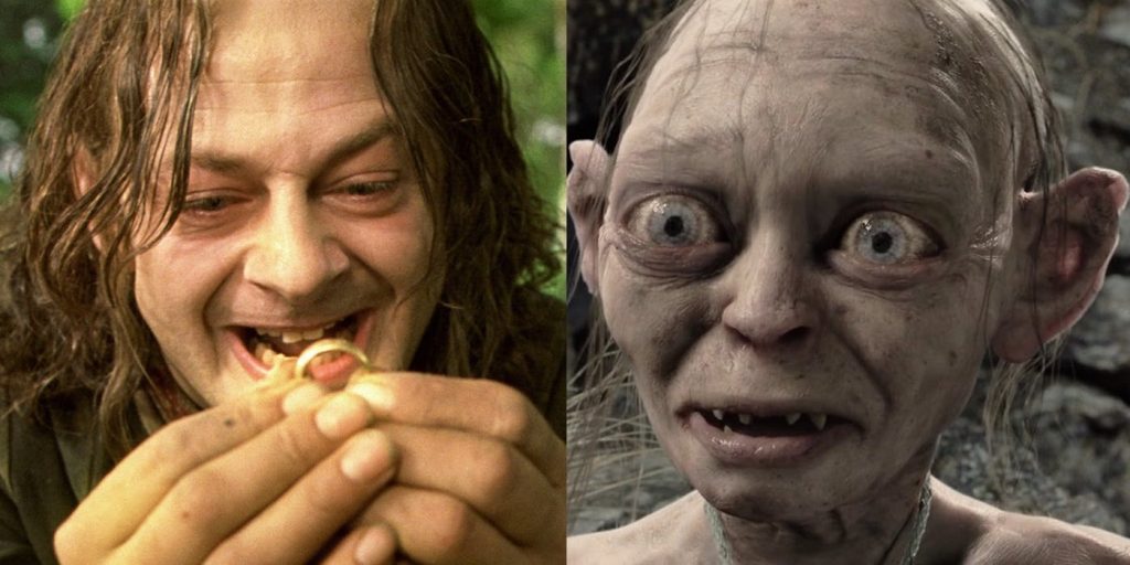 El descenso de Smeagol a Gollum es la representación más clara de la oscuridad de Sauron, que corrompe a un inocente Hobbit en una criatura salvaje que apenas recuerda su nombre. Obsesionado con su "precioso", Gollum finalmente lo recupera, pero a costa de fundirse con él.
