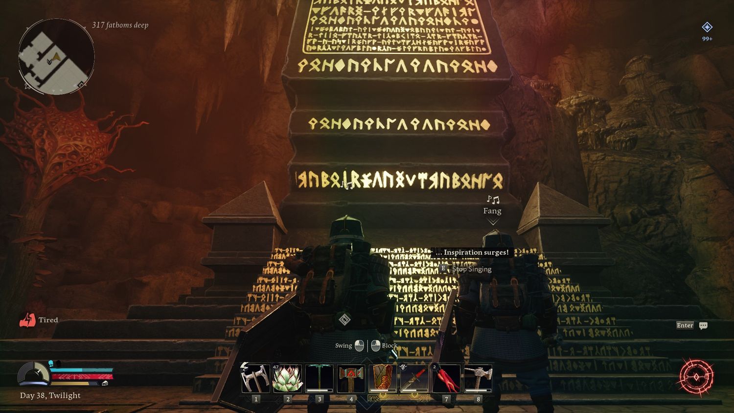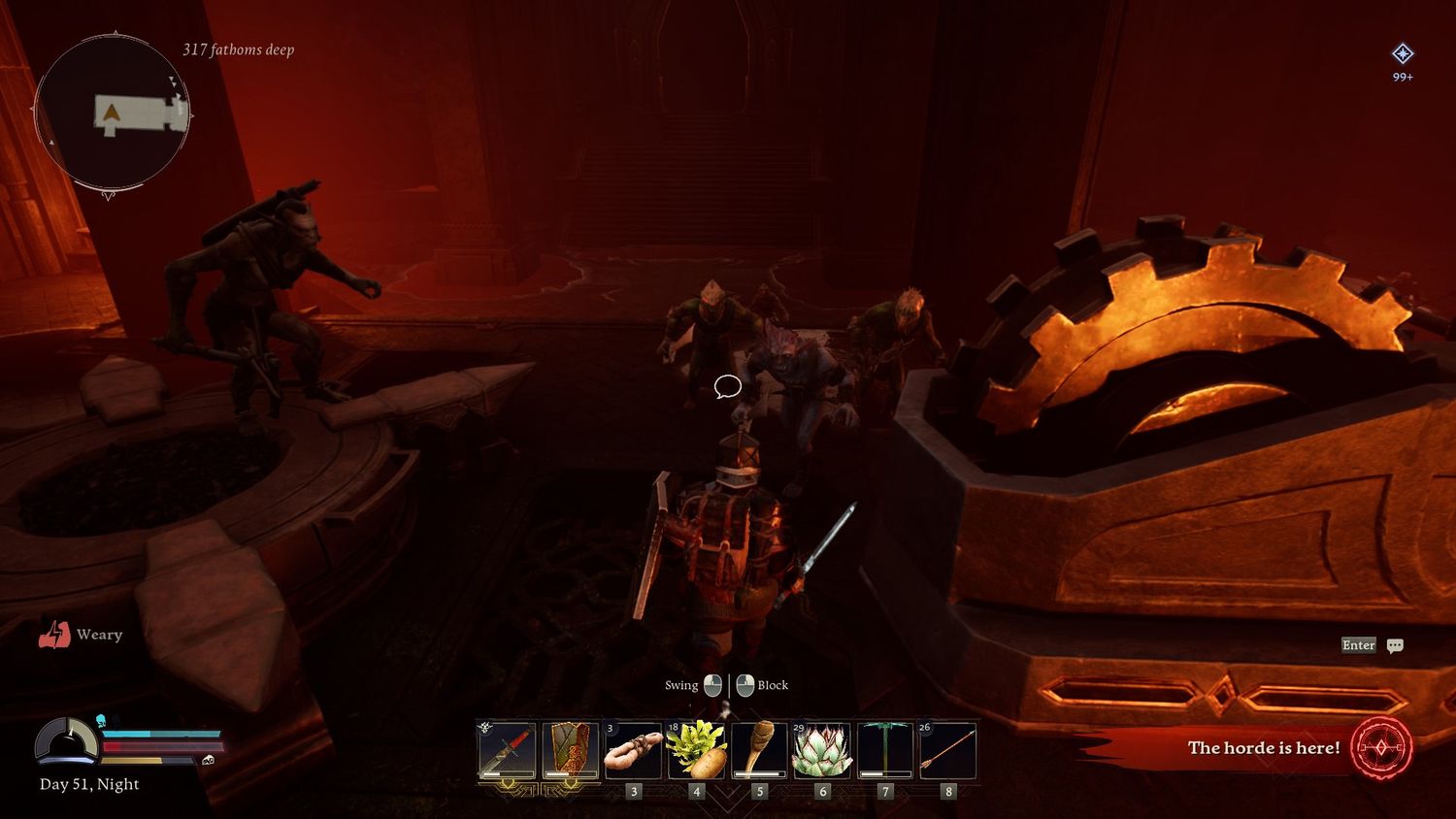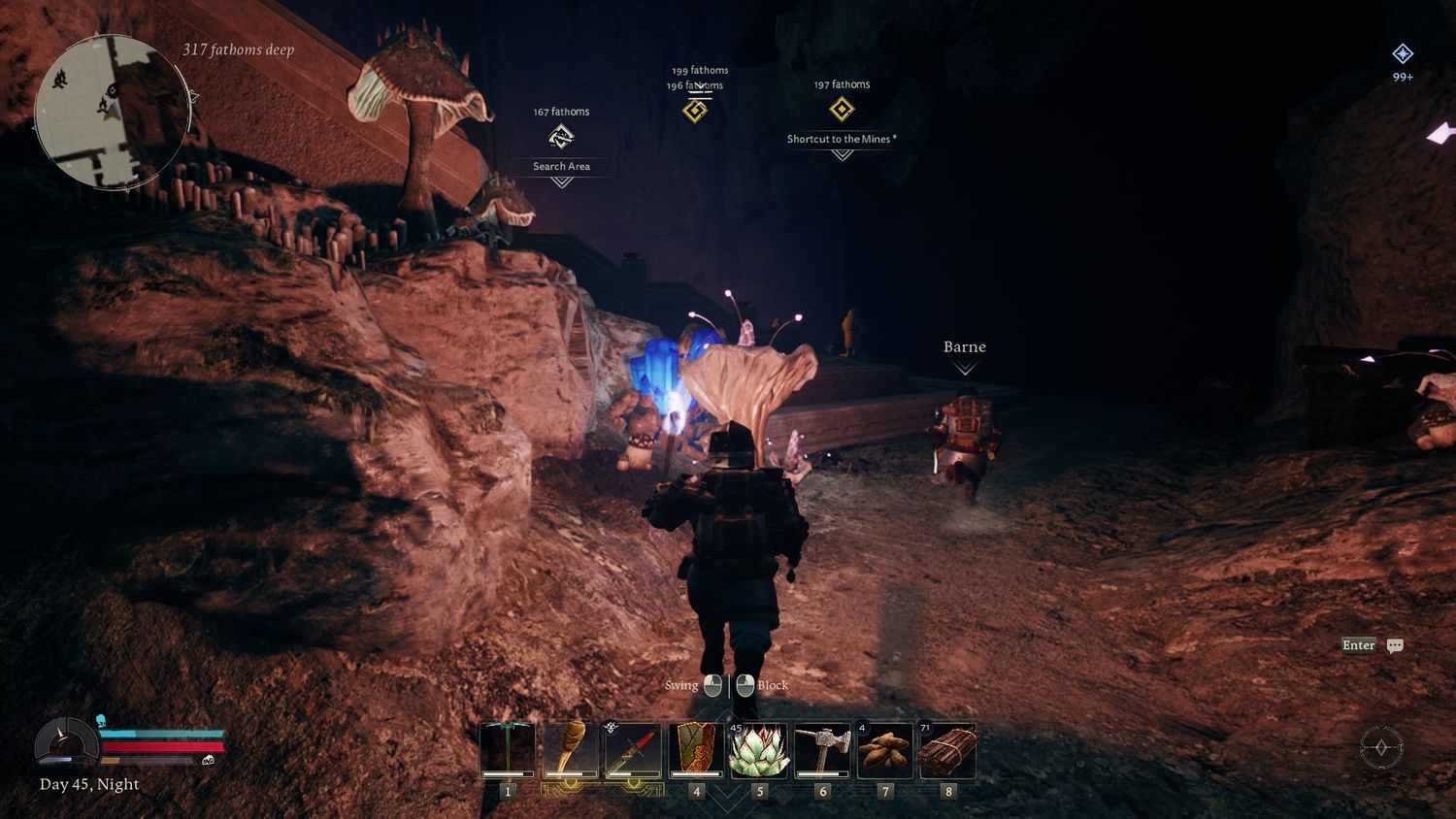 Es posible que en las primeras áreas del juego aparezcan campamentos de mala calidad y desaparezcan rápidamente, pero a medida que avanza se vuelve más complejo, construir casas adecuadas o modernizarlas a partir de importantes estructuras abandonadas se vuelve más atractivo. Hay suficientes amenazas en juego para hacer que una base se sienta como un bastión acogedor, donde se puede restaurar la salud y la cordura y se pueden otorgar beneficios a través de recetas, rituales y mucha cerveza enana. Mantener los metros llenos comienza como una tarea bastante casual y se vuelve más intensa en las partes más bajas de la mina, donde la oscuridad se vuelve más peligrosa y una dependencia cada vez mayor de los viajes rápidos puede quemar raciones a mayores velocidades.