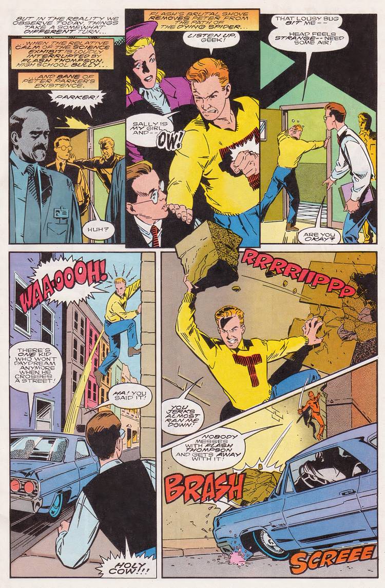¿Y si? #76 – escrito por Terry Austin, con arte de Stuart Immonen – se explayó sobre la sorprendente debilidad causada por el sentido arácnido de Spider-Man. En esta historia, en lugar de que Peter Parker se convirtiera en Spider-Man como de costumbre, fue el matón Flash Thompson quien obtuvo estos increíbles poderes. Con los poderes del Webslinger, Flash rápidamente se convirtió en uno de los criminales más peligrosos de Nueva York.