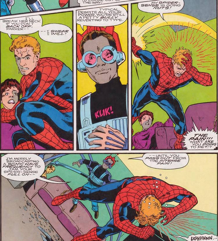 Mientras Peter intentaba luchar contra Flash Thompson, tenía un contraataque para cada una de sus habilidades de Spider-Man… En particular, proyectó una frecuencia de radio que obligó al Sentido Arácnido de Flash a funcionar a toda marcha, noqueando instantáneamente al errante Wallcrawler.
