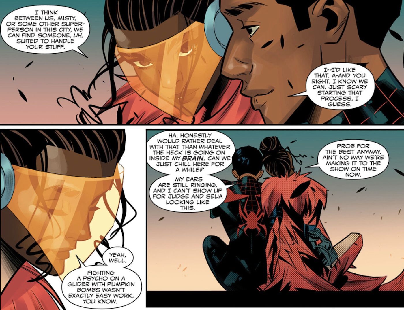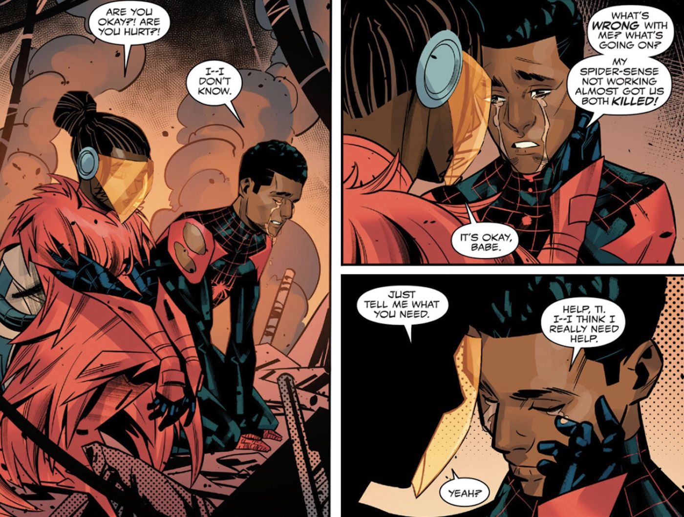 En psicología, la hipervigilancia es un síntoma común del trastorno de estrés postraumático y otros trastornos de ansiedad. Alguien que experimente hipervigilancia a menudo sentirá una sensación de peligro creciente, lo que hará que esté en alerta máxima y temeroso de posibles amenazas. Si bien esta es una condición difícil de tratar para la gente normal, para alguien con un sentido arácnido diseñado para advertirle del peligro, los síntomas se intensificarían hasta un grado aterrador. Estos sentimientos constantes de angustia claramente afectaron a Miles, ya que cae de rodillas y comienza a sollozar una vez que Hobgoblin huye de la escena. Le pregunta a Starling, “¿Que pasa conmigo? ¿Qué está sucediendo? ¡Mi sentido arácnido que no funciona casi hace que nos maten a los dos!Al darse cuenta de que este no es un problema del que pueda salir a puñetazos o telaraña, Miles decide que necesita ayuda de verdad.
