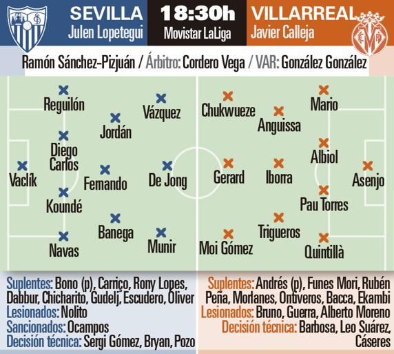 Un once con Sergio Asenjo como portero, con una defensa con Mario Gaspar, Raúl Albiol, Pau Torres y Xavier Quintillà, para formar en el centro del campo con el exsevillista Vicente Iborra, Zambo Anguissa y Manu Trigueros y completar la formación con Moi Gómez, Gerard Moreno y Chukwueze.