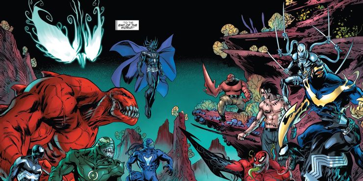 Admitiendo que iría “hasta el fin del mundo” para reunirse con su familia, la siguiente página ofrece a los fanáticos una doble difusión de la bondad de Venom, ya que describe la salva de apertura en lo que parece ser una próxima guerra de simbiontes. Dibujando el equipo “bueno” de simbiontes, incluidos Venom, Sleeper, una nueva versión de Anti-Venom y más en el lado derecho de la imagen, el lado izquierdo muestra un equipo de malos tipo Venom que incluye un simbionte. que parece ser una especie de energía blanca que se enrosca en la forma de los ojos de Venom contra un cielo negro y lúgubre, un diseño que le da un aspecto reconocible de la apariencia de Venom con un tratamiento cósmico salvaje.