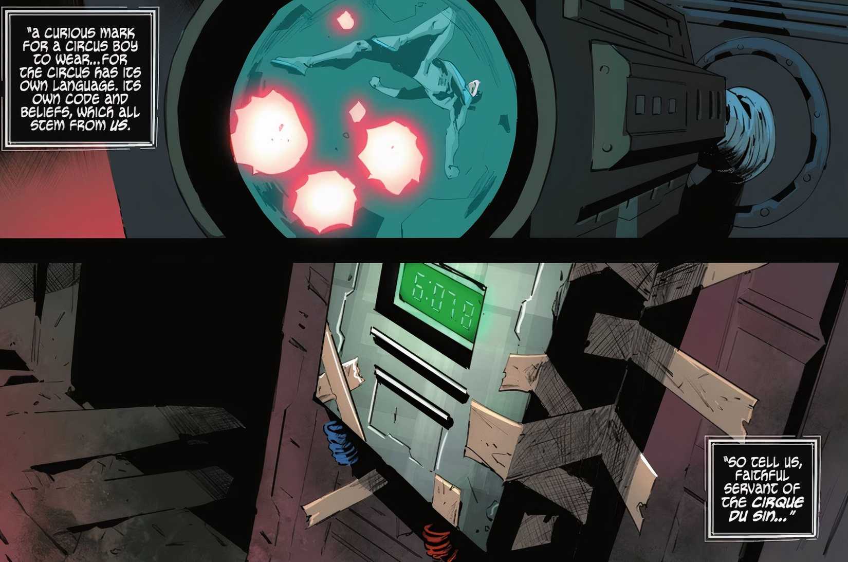 A pesar de aparecer en las tres primeras páginas de ala nocturna # 119, el meta-payaso no reaparece hasta los momentos finales, donde se revela que él y Olivia están confabulados. Los dos villanos observan a Nightwing a través de las transmisiones de seguridad mientras lucha contra el sistema de seguridad de disparos láser de Spheric Solutions. El payaso llama la atención sobre el “marca” en el pecho de Dick, diciendo“Una marca curiosa para que la use un niño de circo… Porque el circo tiene su propio lenguaje. Su propio código y creencias, que provienen todas de nosotros. Entonces cuéntanos, fiel servidor del circo del pecado… ¿qué significa un pájaro en la carpa del circo?” Olivia responde, “Un pájaro significa muerte”.