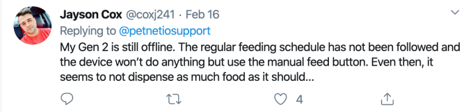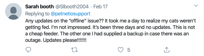 El 19 de febrero, la compañía dijo que está “trabajando en estrecha colaboración con nuestro proveedor de servicios de terceros en lo que respecta a la interrupción”, antes anunciando el 22 de febrero que los SmartFeeders regresan en línea.