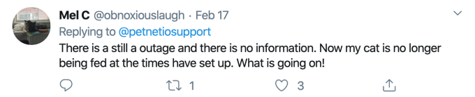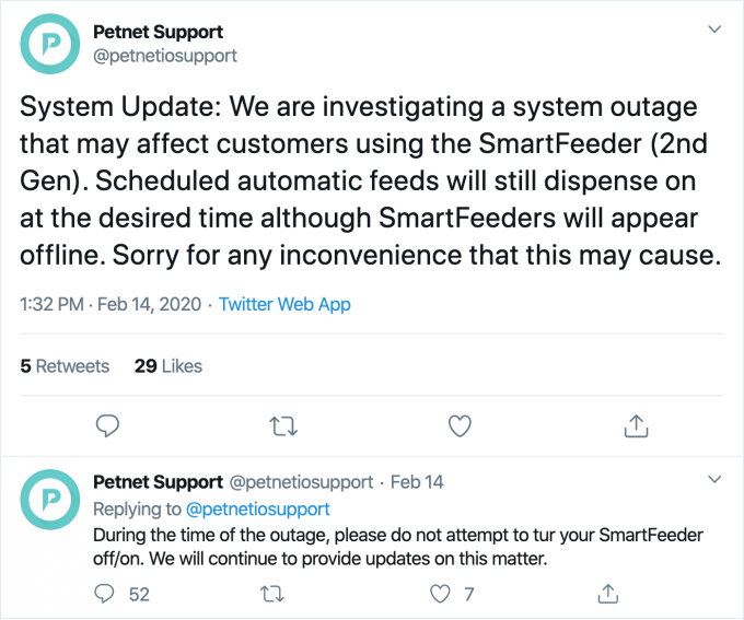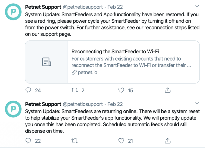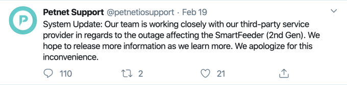 Petnet primero anunciado el 14 de febrero que estaba investigando una interrupción del sistema que afectaba a sus SmartFeeders de segunda generación que hicieron que los alimentadores parecieran estar desconectados. La compañía dijo en un tweet que los SmartFeeders aún podían dispensar según lo programado, pero varios clientes respondieron que sus dispositivos también habían dejado de distribuir alimentos o que no lo hacían según lo programado.