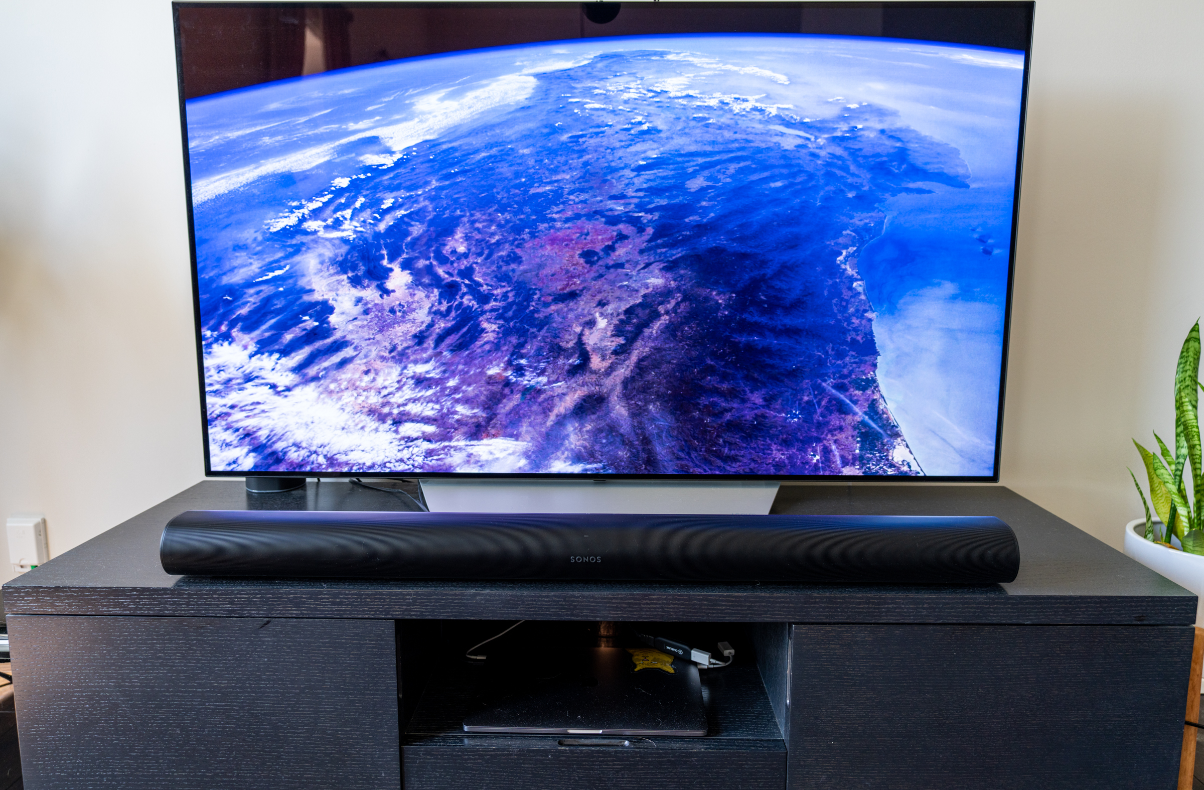 Para tener una idea de cuánto tiempo es, funciona casi todo el largo de mi televisor OLED C7 LG 65 ″. También es un poco más alto que el Sonos Beam, llegando a 3.4 “. Para mi uso, eso fue lo suficientemente corto como para no oscurecer ninguna de las pantallas del televisor cuando está sentado en un banco de TV frente al televisor desde mi ángulo de visión normal, pero su kilometraje puede variar, y si tuvo un similar configurar con el Beam, solo tenga en cuenta que necesitará un poco más de espacio libre con el Arc.