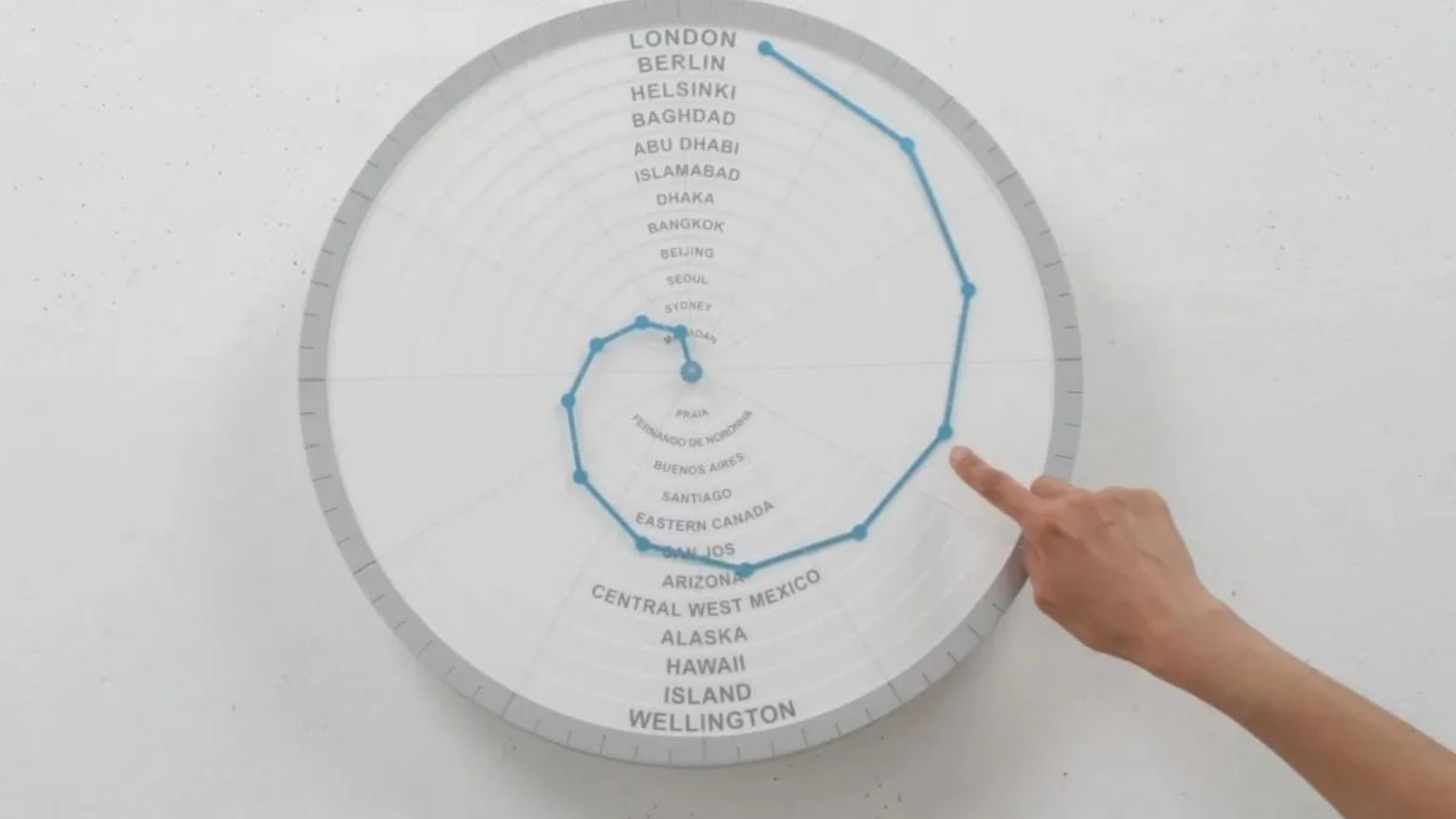 El diseño del reloj es lo que sorprende a todo el mundo. Como podemos ver en las imágenes, tiene 24 círculos concéntricos. Cada uno representando un huso horario y además en cada círculo aparece señalada una ciudad de referencia: por ejemplo Londres, Berlín o Arizona, etc…