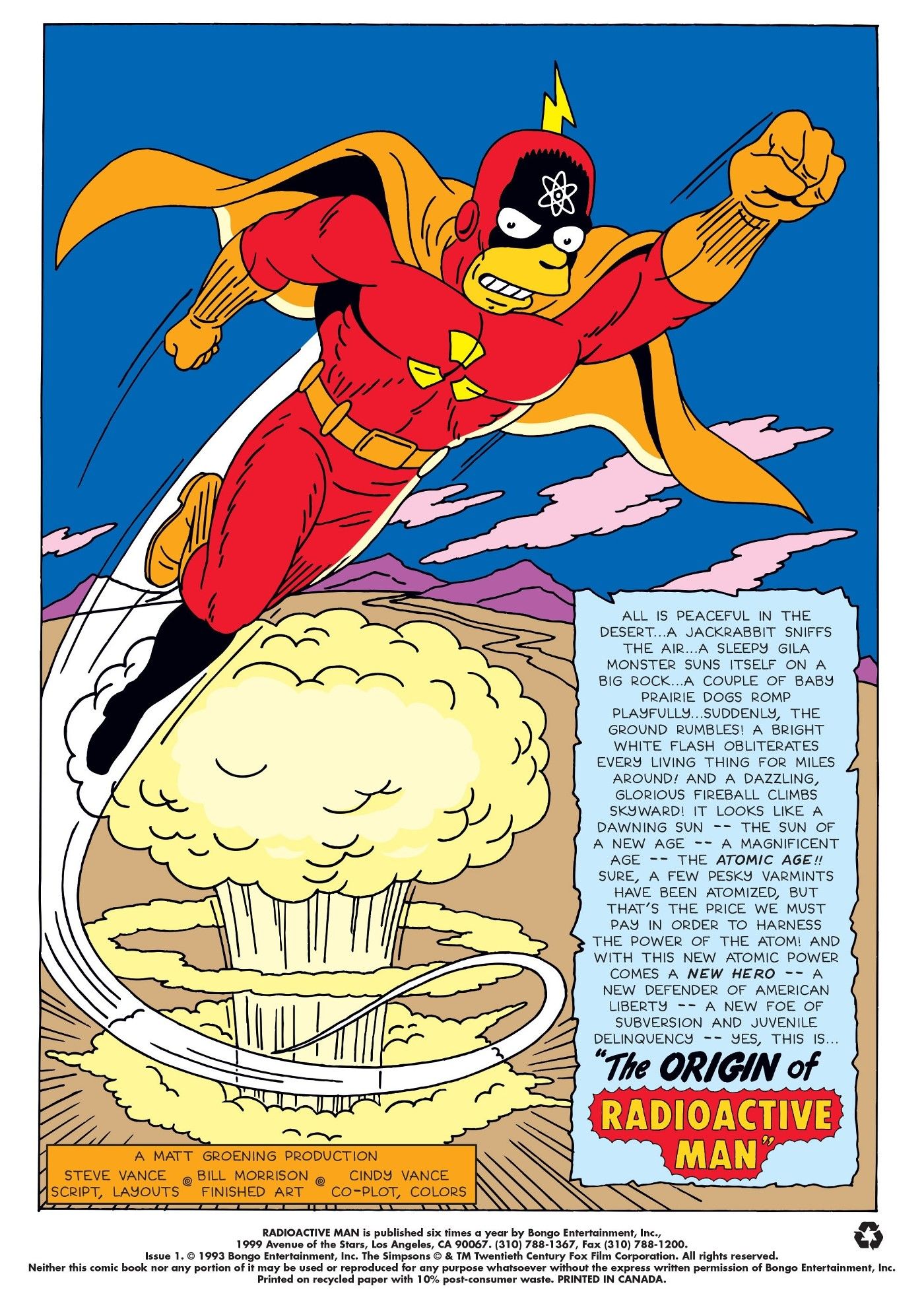 Famoso por ser interpretado por Rainier Wolfcastle, parecido a Schwarzenegger, Radioactive Man también es conocido por su compañero Fallout Boy, cuyo El nombre en realidad inspiró a la banda de rock estadounidense del mismo nombre.. Cómics Bongó Hombre radiactivo La serie limitada original de 6 números fue escrita por Steve Vance, con arte de Bill Morrison y Cindy Vance, y fue una parodia hilarante de historias icónicas de Marvel y DC, emulando el crecimiento de los cómics desde los años 50 hasta los 90, con un metacomentario. eso sería más apreciado ahora que hace 30 años.