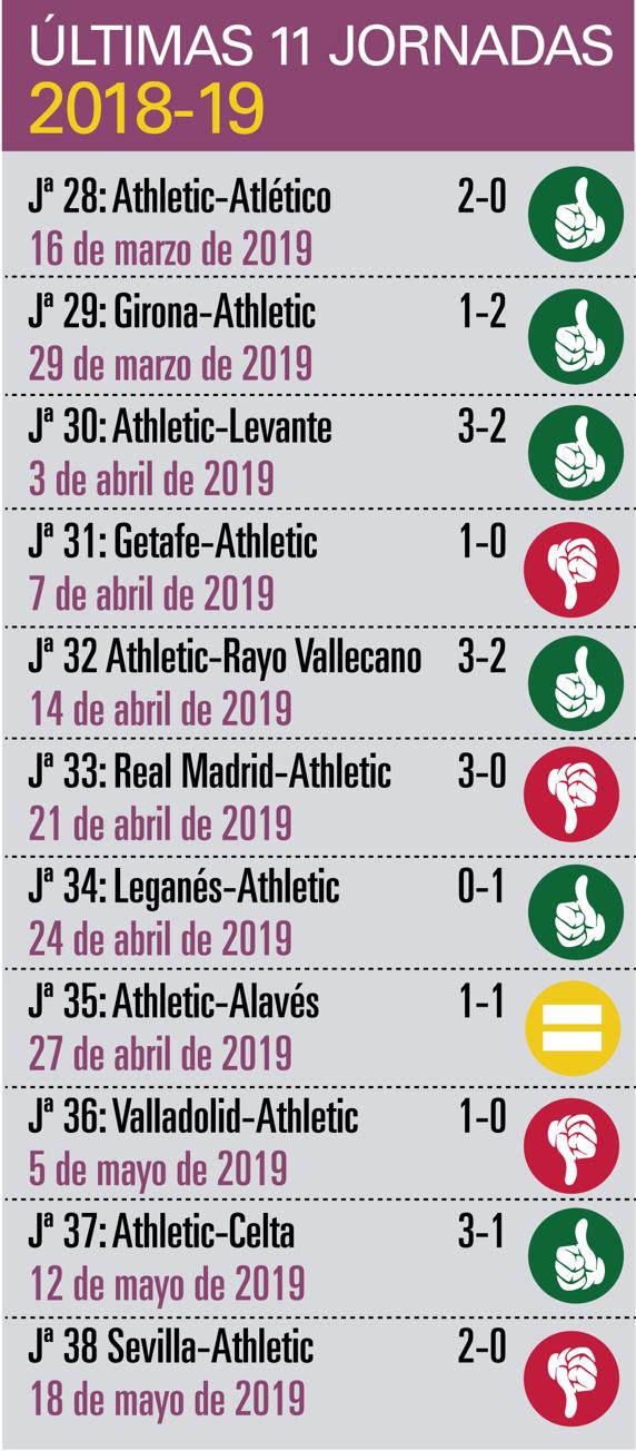 Los leones retomaron la senda de las victorias ganando al Rayo en casa (3-2). Después se sucedieron la derrota en el Bernabeú (3-0), el triunfo en Leganés (0-1), el empate con el Alavés en Bilbao (1-1), el partido perdido en Valladolid (1-0), la victoria ante el Celta (3-1) y el 2-0 del Sánchez Pizjuán, con aquel balón al larguero de Iñigo Martínez con 1-0 en el marcador que bien pudo valer la clasificación europea. No se logró, pero los rojiblancos hicieron un sprint final de Liga que valía la séptima plaza. Una buena referencia para lo que espera desde el domingo.