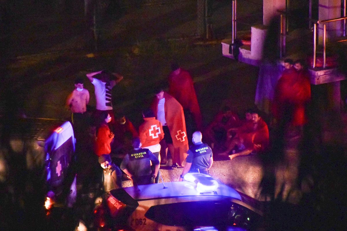 Varios miembros de la Guardia Civil y voluntarios de Cruz Roja atienden a un grupo de marroquíes en Ceuta.