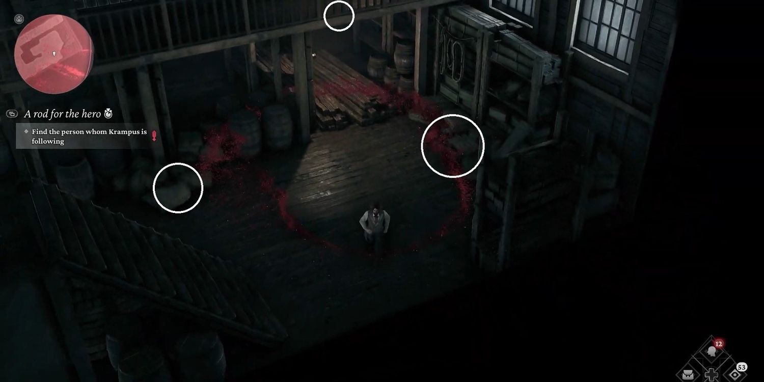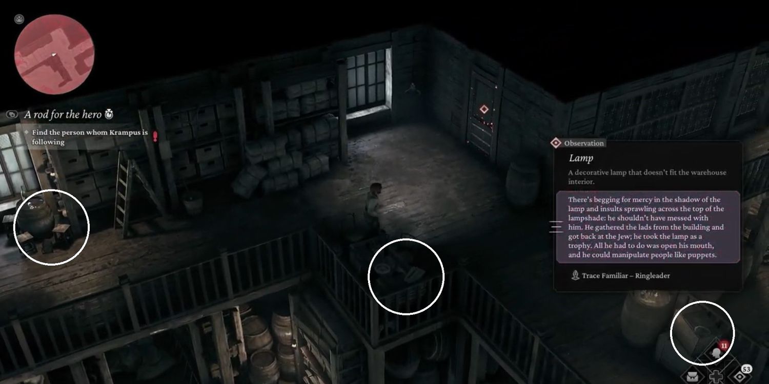 Al entrar, Wiktor sentirá que Krampus sigue a alguien en el área. Tocar una puerta en el piso de arriba revela que alguien está atrapado adentro, pero puede comunicarse golpeando la puerta. Para obtener más información de esta persona atrapada, Wiktor necesita encontrar más observaciones dentro del almacén.. Como se muestran en las fotos de arriba, estas Observaciones incluyen:
