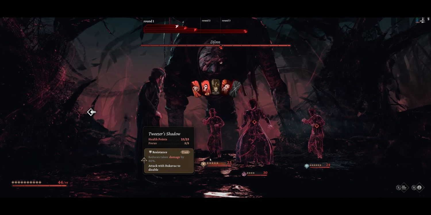 Luchar contra Djinn implica derrotar a dos oleadas de enemigos, la primera es Tweezer, Leila y su padre abusivo. En la primera ola, Djinn usará Bloody Debt, que causa alrededor de 11 daños después de un retraso de algunos turnos. Sin embargo, El compañero de Wiktor, Upyr, puede eliminar este efecto de estado.así que elimina el perjuicio justo antes de que expire para maximizar el tiempo de infligir daño a los enemigos.
