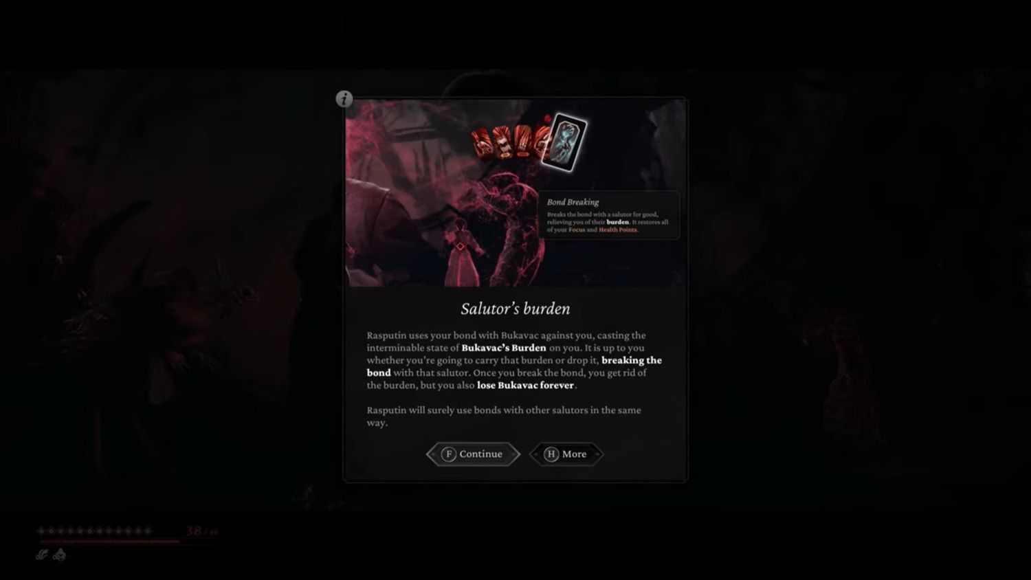 Romper un vínculo con un Salutor eliminará su carga asociada y curará completamente los puntos de salud y el enfoque de Wiktor. pero también eliminará permanentemente a ese Salutor por el resto de la pelea. Para maximizar la usabilidad, esta opción sólo debe usarse cuando Wiktor esté a punto de morir..