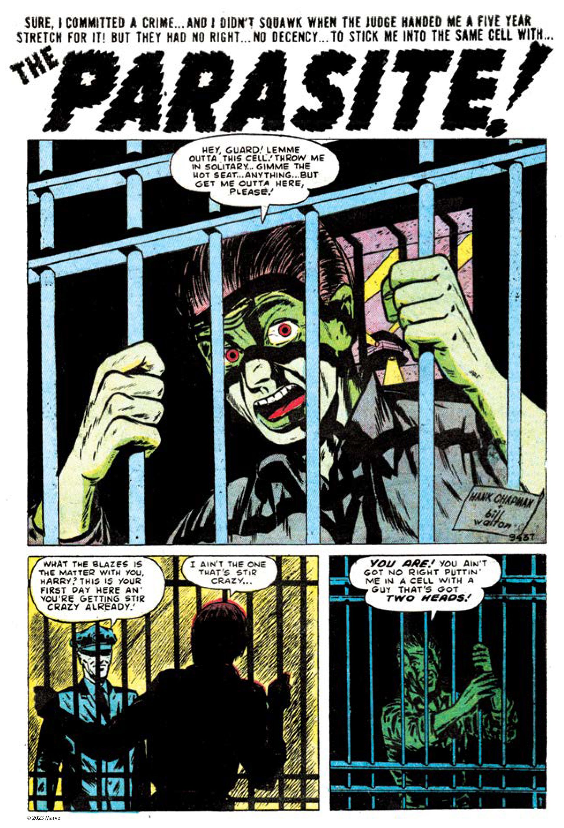 La biblioteca de cómics de Atlas: Aventuras en el terror Volumen uno reimprime los primeros ocho números del cómic del mismo nombre y presenta historias de creadores legendarios como Gene Colan, Mike Sekowsky, Basil Wolverton y Joe Sinnott. Estas historias, creadas antes de la llegada de la Autoridad del Código del Cómic, traspasaron los límites y pusieron a prueba las costumbres y convenciones sociales de la época. Fantagraphics ha proporcionado con una historia previa de Aventuras en el terror, llamado “El Parásito”. Escrita por Hank Chapman y dibujada por Bill Walton, la historia es innegablemente espeluznante, mezcla hábilmente horror corporal y ciencia ficción, creando en última instancia una experiencia inquietante.