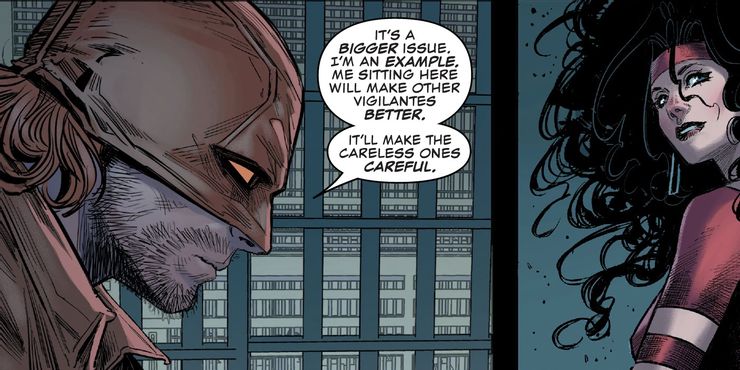 Como personaje, Daredevil podría decirse que se caracteriza por tres luchas principales: su compromiso con su fe católica de toda la vida, la hipocresía de luchar contra la corrupción como abogado de día pero como justiciero de noche, y la batalla para controlar sus tendencias violentas. Estas luchas, aunque convincentes, a menudo dan como resultado que el personaje de Matt Murdock se comporte de manera increíblemente egoísta; colocando sus dilemas morales por encima del bienestar de sus seres queridos y el bien mayor de Hell’s Kitchen. Si bien ambos casos del encarcelamiento de Matt muestran que se enfrenta a sus tres luchas principales y, como resultado, termina siendo un mejor personaje, también son períodos en los que Matt ha permitido que su egoísmo eclipse cómo puede servir mejor a Hell’s Kitchen como Daredevil.