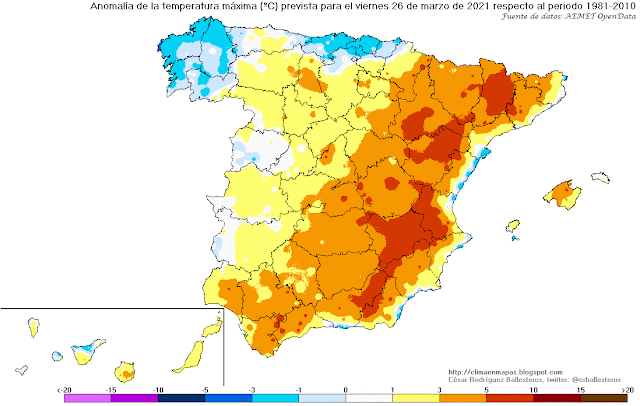 Los termómetros marcarán más de 20º en casi todo el país y se llegará a 25º en el interior de Galicia, el Cantábrico oriental, el valle del Ebro, el interior de Cataluña, la zona centro y buena parte de la mitad sur, mientras que es posible que se rocen o superen los 30º en el interior sur de Galicia, Extremadura y Andalucía. Serán los primeros 30º del año que registra la red de Aemet en la Península, cota que ya se alcanzó el pasado 24 de marzo en Tasarte (Gran Canaria). El 29 de enero, durante un inusual periodo cálido en mitad del invierno, ya se llegaron a rozar los 30º en Valencia y en Alicante.