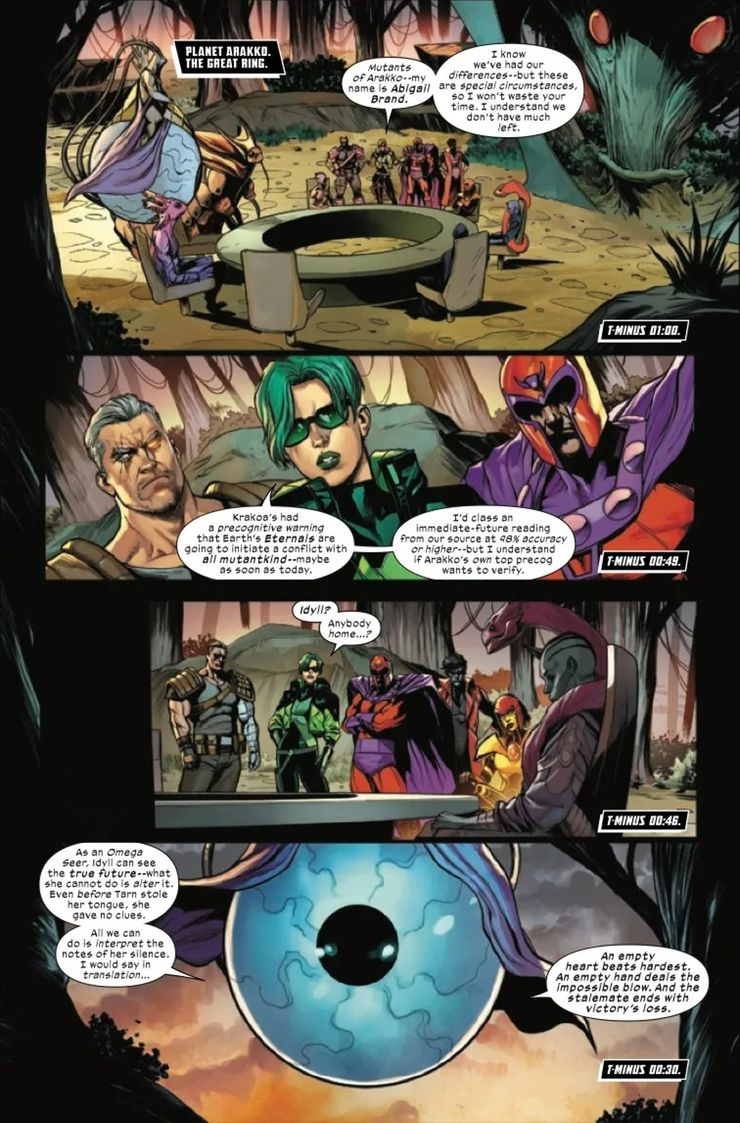 Ojalá, X-Men Rojo #5 revelará si Magneto fue o no realmente asesinadoo si tiene un plan de respaldo secreto para la resurrección fuera de los típicos Protocolos de resurrección de Krakoan, pero la ominosa profecía de Ora Serrata de que “El latido de un corazón vacío es más fuerte”, Seguro que suena como de alguien la muerte inspirará a otros a luchar. La vista previa muestra que Krakoan’s Cable, Nightcrawler y Abigail Brand tienen intentó para advertir al Gran Anillo Arakki lo mejor que puedan, ya que saben que la única forma de luchar contra un asalto Eterno es estar preparados y, sin embargo, al final de la segunda página, está claro que el asalto de Uranos está a punto de comenzar, con o sin su preparación. Storm está fuera del planeta, en Krakoa, apoyando al Consejo Silencioso en su planificación de guerra, lo que deja solo 9 mutantes de nivel Omega en el Gran Anillo para luchar contra Uranos… pero el hecho de que los lectores saber Uranos derrotó sin ayuda a los 9 mutantes de nivel dios, en una hora o menos, es realmente aterrador.