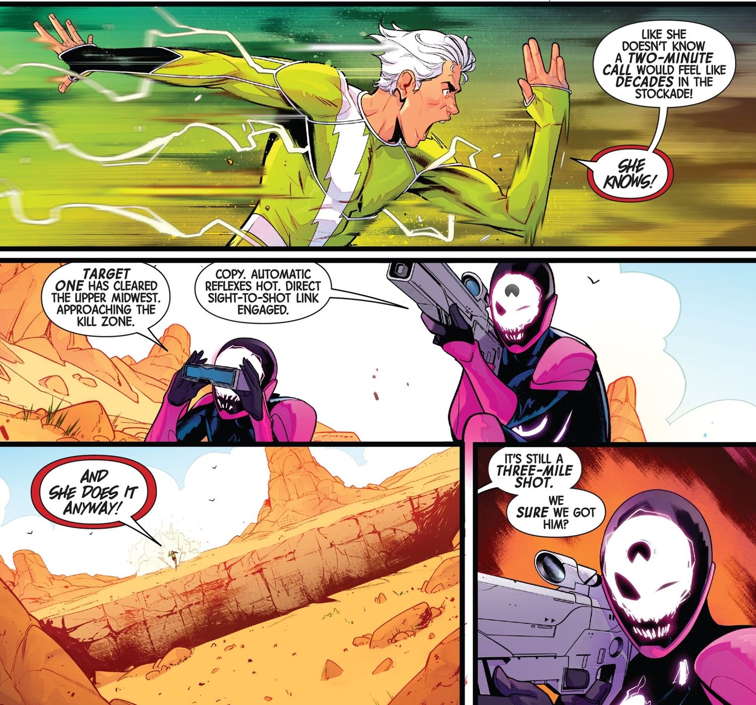 Como uno de los héroes más rápidos del Universo Marvel, pocas cosas pueden frenar Azogue hacia abajo, especialmente cuando ya ha alcanzado altas velocidades. Eso está cambiando gracias a que el Mago introdujo la táctica perfecta para sacar a Pietro del juego… y posiblemente fuera del planeta. Mientras el velocista corre a través del mar, desahogando su frustración con su hermana, la tripulación del Mago lo golpea con una nueva y poderosa arma: un perdigón antigravedad.