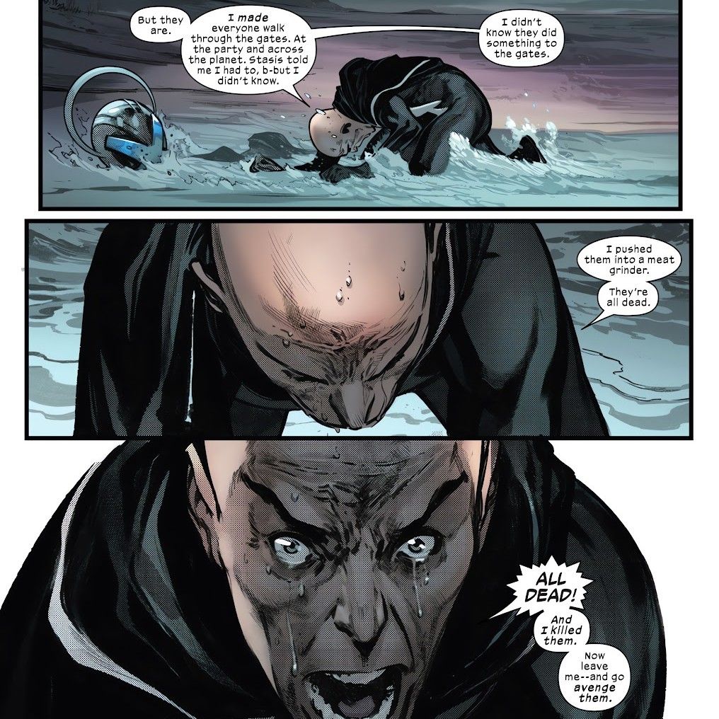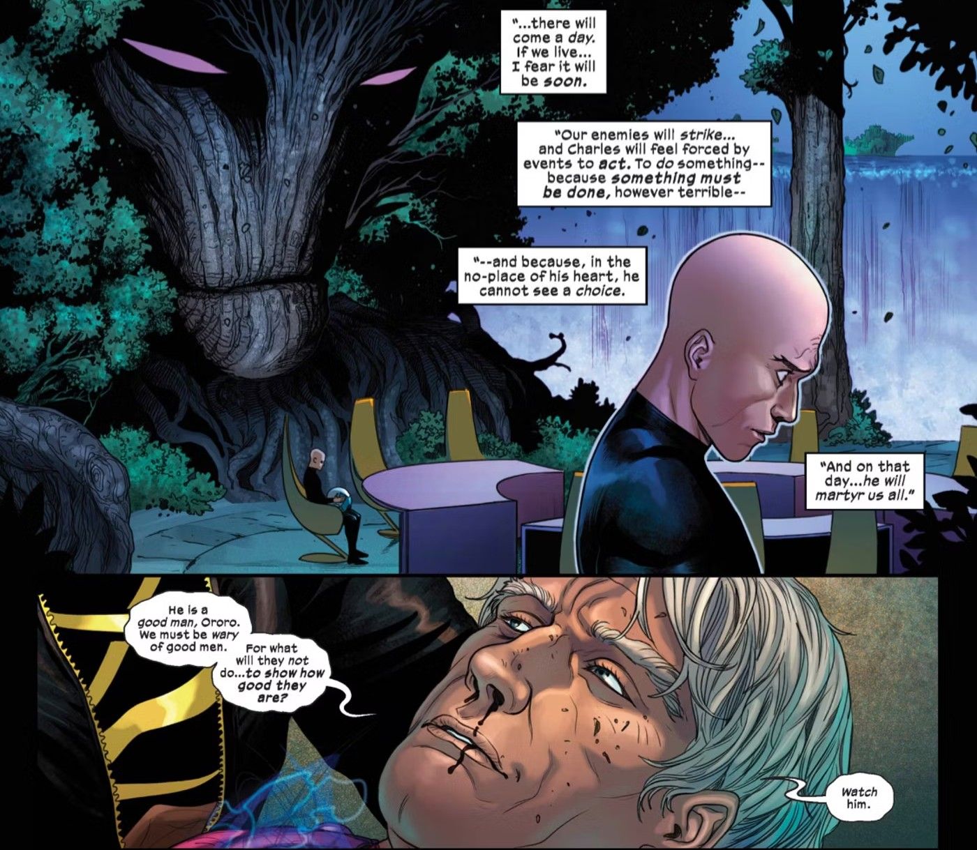 El Profesor X juega perfectamente en las manos de Orchis. Explotan su nobleza, la misma debilidad que Magneto ha identificado durante mucho tiempo, y la misma debilidad sobre la que una vez advirtió a Storm. Magneto siempre ha contrarrestado a Xavier, pero sin él (y después de la traición de Moira X), no queda nadie para proteger a Xavier de sí mismo. Magneto tenía razón sobre Xavier, y con su último aliento describió, con asombrosa precisión, exactamente cómo Xavier le fallaría a Krakoa, el X Meny toda la raza mutante.