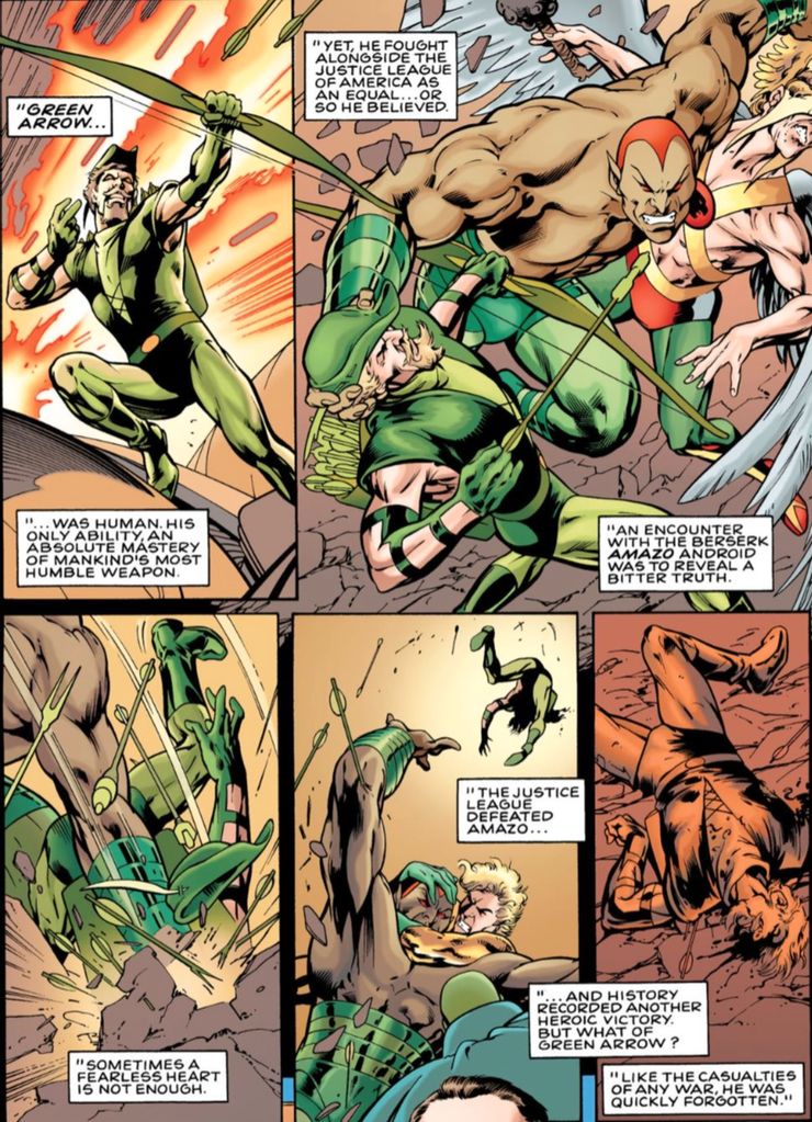 Sin embargo, debido a que no se muestra pereciendo como sus camaradas, existe la posibilidad de que Arrow haya sobrevivido. Pero si lo hiciera, podría terminar yendo por el mismo camino oscuro explorado en uno de los peores mundos del Multiverso de DC. JLA: El Clavo por Alan Davis y Mark Farmer describe un Universo DC donde los padres de Superman, los Kent, nunca lo descubrieron, lo que lleva a un mundo sin la presencia optimista del Hombre de Acero. Tragedia tras tragedia le sucede a varios héroes, incluido Green Arrow, que sufre varias lesiones permanentes en una batalla con Amazo. En el tiempo posterior a su altercado con Amazo, Oliver se convierte en una amarga cáscara de sí mismo, culpando a la Liga y difundiendo conspiraciones infundadas sobre ellos.