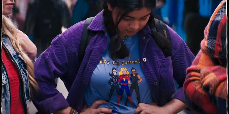 En los primeros segundos del tráiler, se muestra a Kamala en la escuela usando lo que la chica mala Zoe Zimmer (Laurel Marsden) señala como “otra camiseta de los Vengadores”. La camiseta de Kamala tiene tres héroes femeninos: en el centro, liderando el equipo, está obviamente la Capitana Marvel, a su izquierda está Valkyrie (Tessa Thompson) y a su derecha un personaje que parece ser Hope van Dyne/Wasp (Evangeline Lilly). ). La camiseta tiene un aspecto de bricolaje, por lo que es probable que Kamala la haya hecho ella misma con los héroes que admira, pero aun así, esta podría ser una pista divertida y sutil sobre quién podría regresar para un posible Vengadores 5. Vale la pena señalar que estos tres personajes son del equipo de A-Force objeto de burlas en Fin del juegoy con Pepper Potts retirado después de la muerte de Tony, los Guardianes de la Galaxia por su cuenta, Wanda/Scarlet Witch lidiando con cosas más grandes y oscuras, Shuri posiblemente asumiendo el papel de Black Panther y Okoye defendiendo a Wakanda, Captain Marvel, Wasp y Valkyrie tiene sentido como miembros de un nuevo equipo de Vengadores.