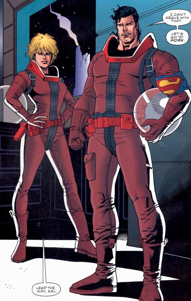 superman contra extraterrestrestambién conocido como superhombre/alienígenas, cuenta con el equipo creativo de Dan Jurgens, Kevin Nowlan, Gregory Wright, Android Images y Bill Oakley. El problema enfrenta a Clark Kent contra uno de sus enemigos más duros, aún más duro por la terrible decisión de Superman de ser misericordioso con los xenomorfos. Con su traje hecho jirones y con el torso desnudo durante gran parte de la miniserie, el número final le proporciona un traje espacial rojo. Sin embargo, no se parece en nada a su disfraz habitual. Necesitando poder respirar para la siguiente etapa de su aventura, Superman recibe un traje de su nueva aliada, Kara (inspirada en Supergirl, aunque en realidad no es ella). Ella también le entrega el trozo de la pieza central rota de su antiguo disfraz y dice: “Oh, encontré esto en las rocas cuando te estaba buscando. Parece que tú y este símbolo combinan bastante bien”. Esto le permite a Superman tener su símbolo clásico de esperanza, aunque en un lugar nuevo. Lo ata a su brazo, lo cual es un muy buen movimiento visualmente considerando que este traje es estándar y no significa que este es, de hecho, Superman. Tiene un aspecto muy rudo de los 90, pero este no ha sido un aspecto que se le haya dado exclusivamente en los cómics. Su símbolo es uno de los aspectos más importantes de su identidad, particularmente cuando se trata de reconocimiento. Su salmonete de la era no es tan largo o distinto en este cruce como en otros cómics de esta época.