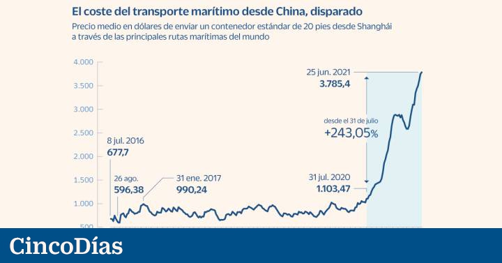 El coste de enviar un contenedor de mercancía desde China al resto del mundo a través de las rutas comerciales más comunes está disparado. En solo 11 meses, desde el 31 de julio de 2020 hasta el 25 de junio de 2021, el precio medio del envío del contenedor estándar de 20 pies, el más común en el comercio internacional, ha pasado de 1.103 dólares a 3.785, lo que supone un 243% más.